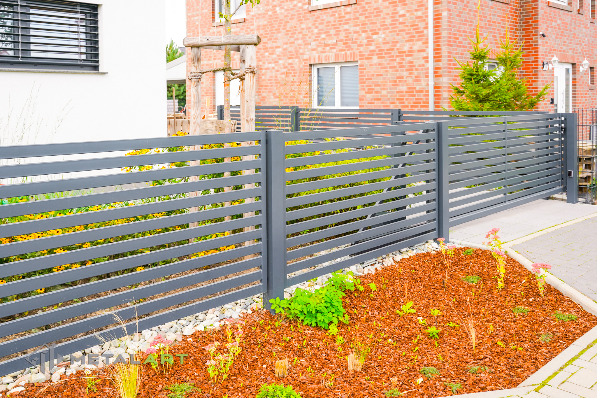 Dieses Zaunmodell harmoniert in seiner Grundform gut mit moderner Architektur. Es wird von Kunden gewählt, die Wert auf Einfachheit legen, den Raum deutlich hervorheben und die Sichtbarkeit begrenzen wollen.