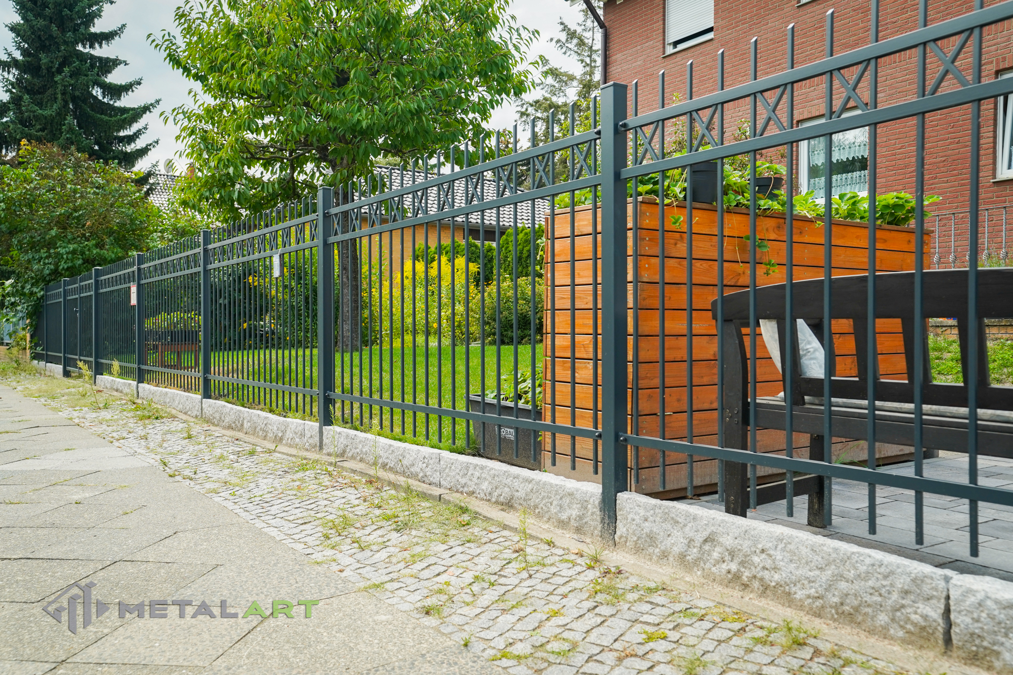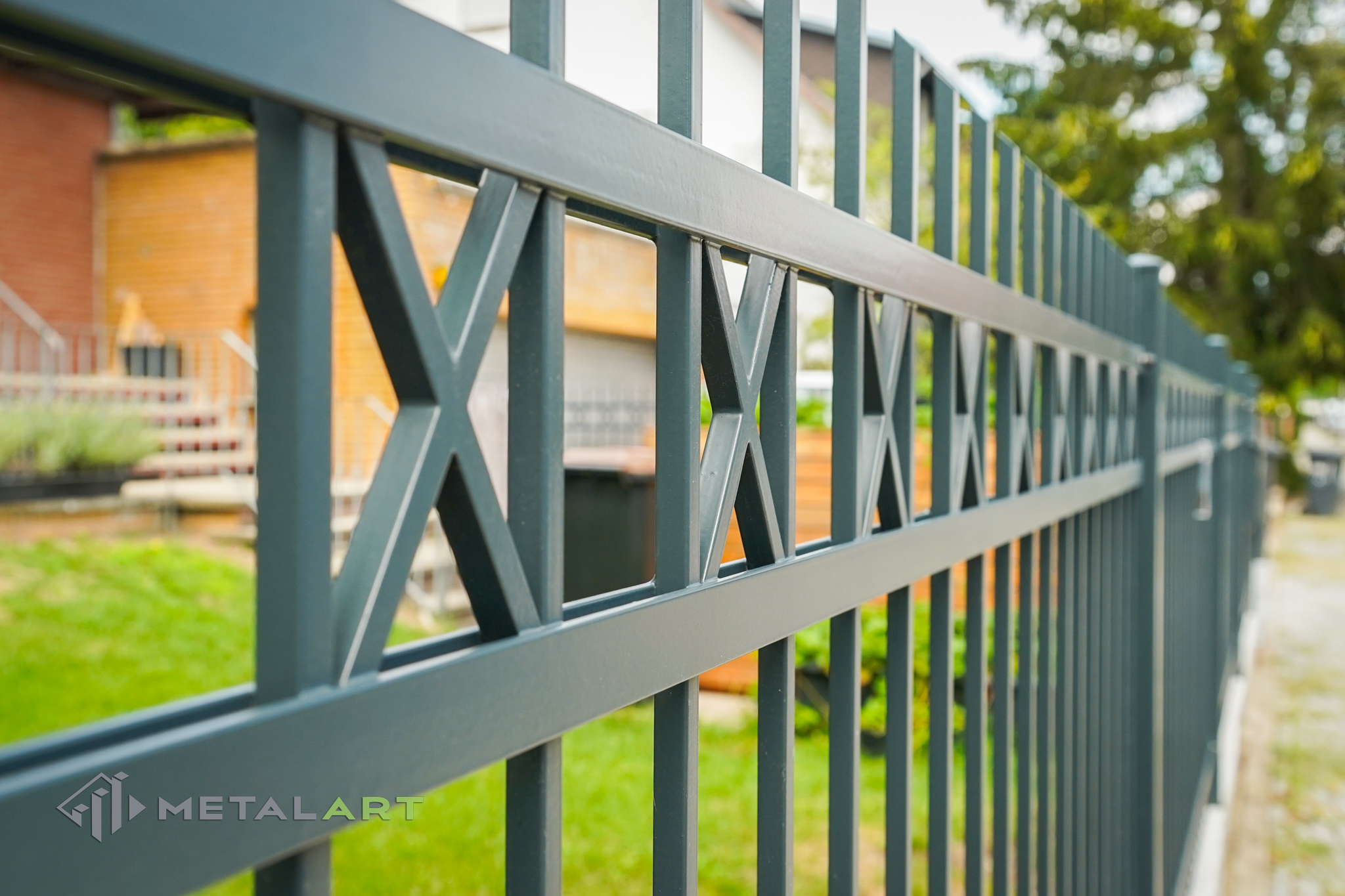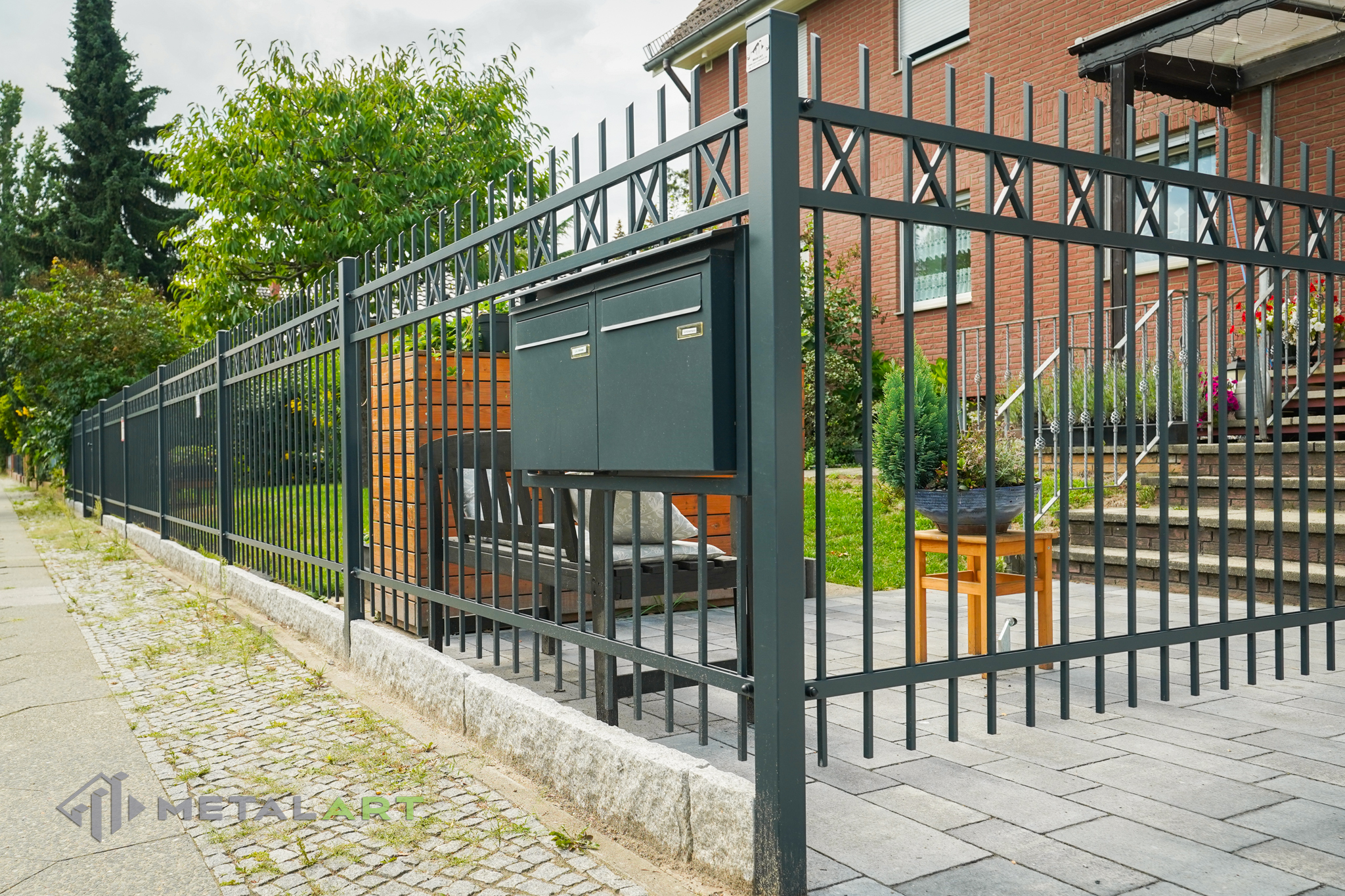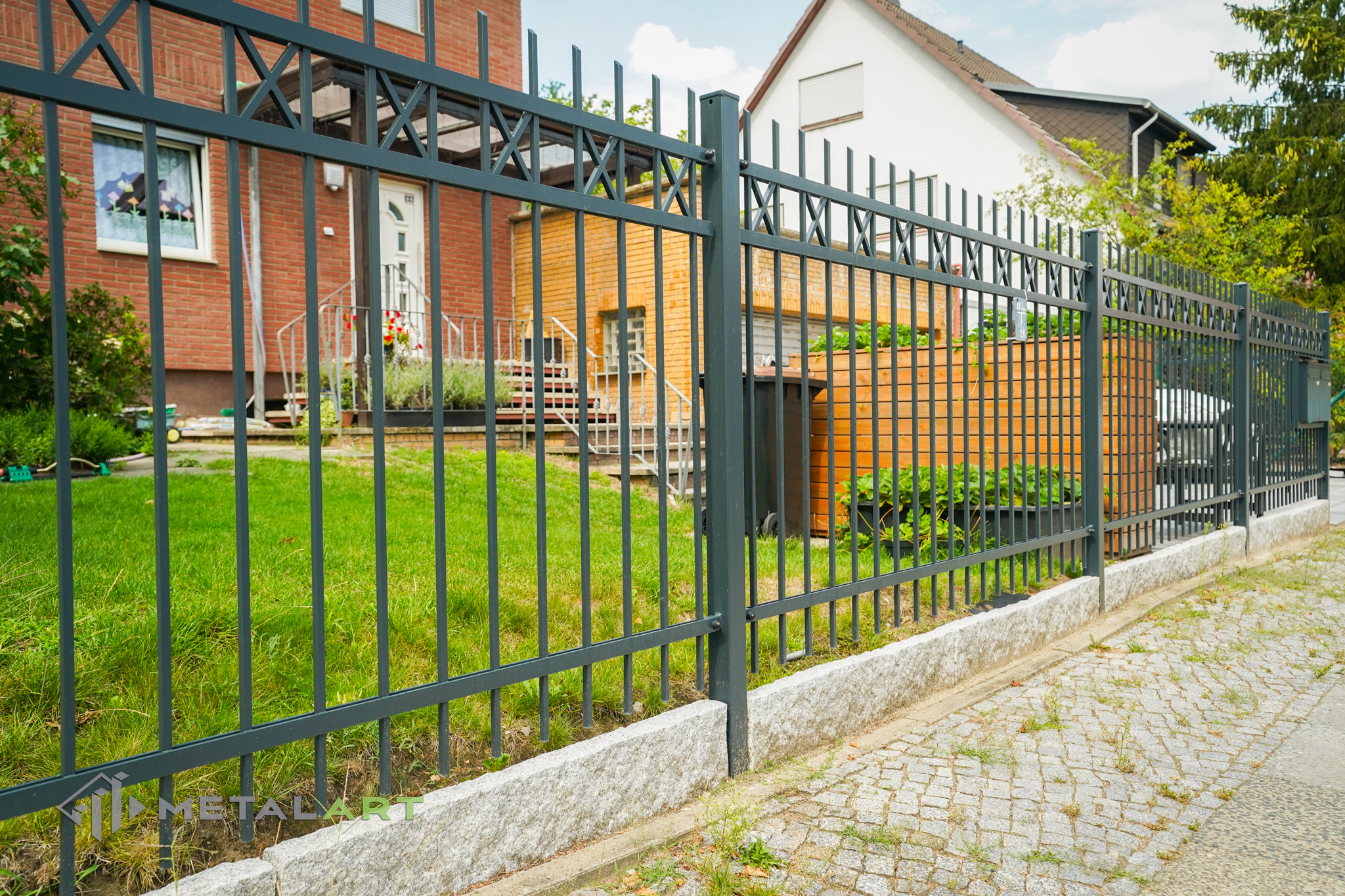 In diesem Projekt wurde der obere und untere Teil des Zauns dekoriert. Gerade Linien sind das dominierende Element, das das Zaunfeld verdickt, und das Ganze wird mit einem anmutigen Ornament auf der Oberseite abgeschlossen. Die Zaunkappen verleihen dem Zaun Erhabenheit und ordnen gleichzeitig die Vielzahl der hier verwendeten Ornamente. Ein wirklich schöner Zaun!