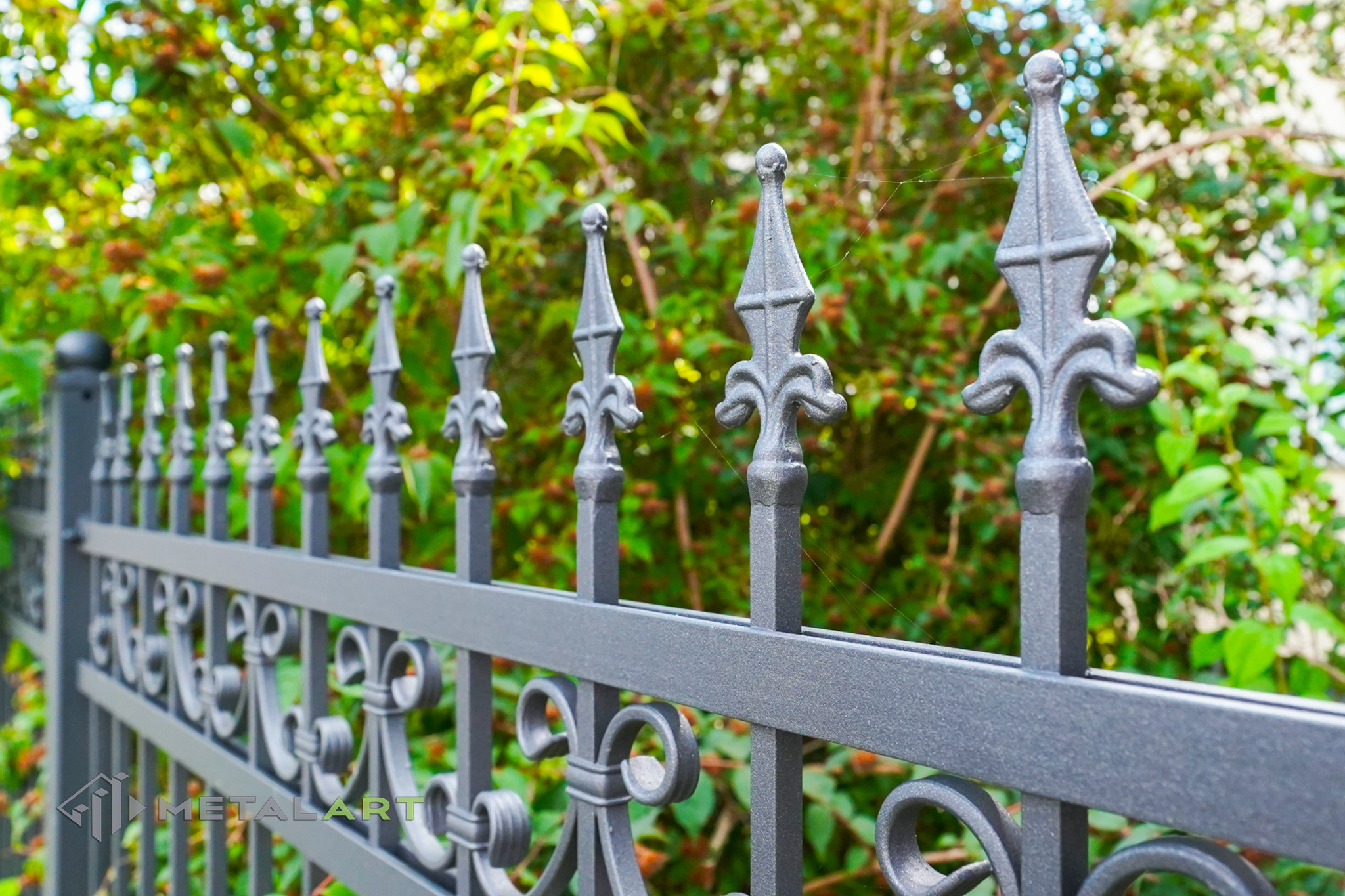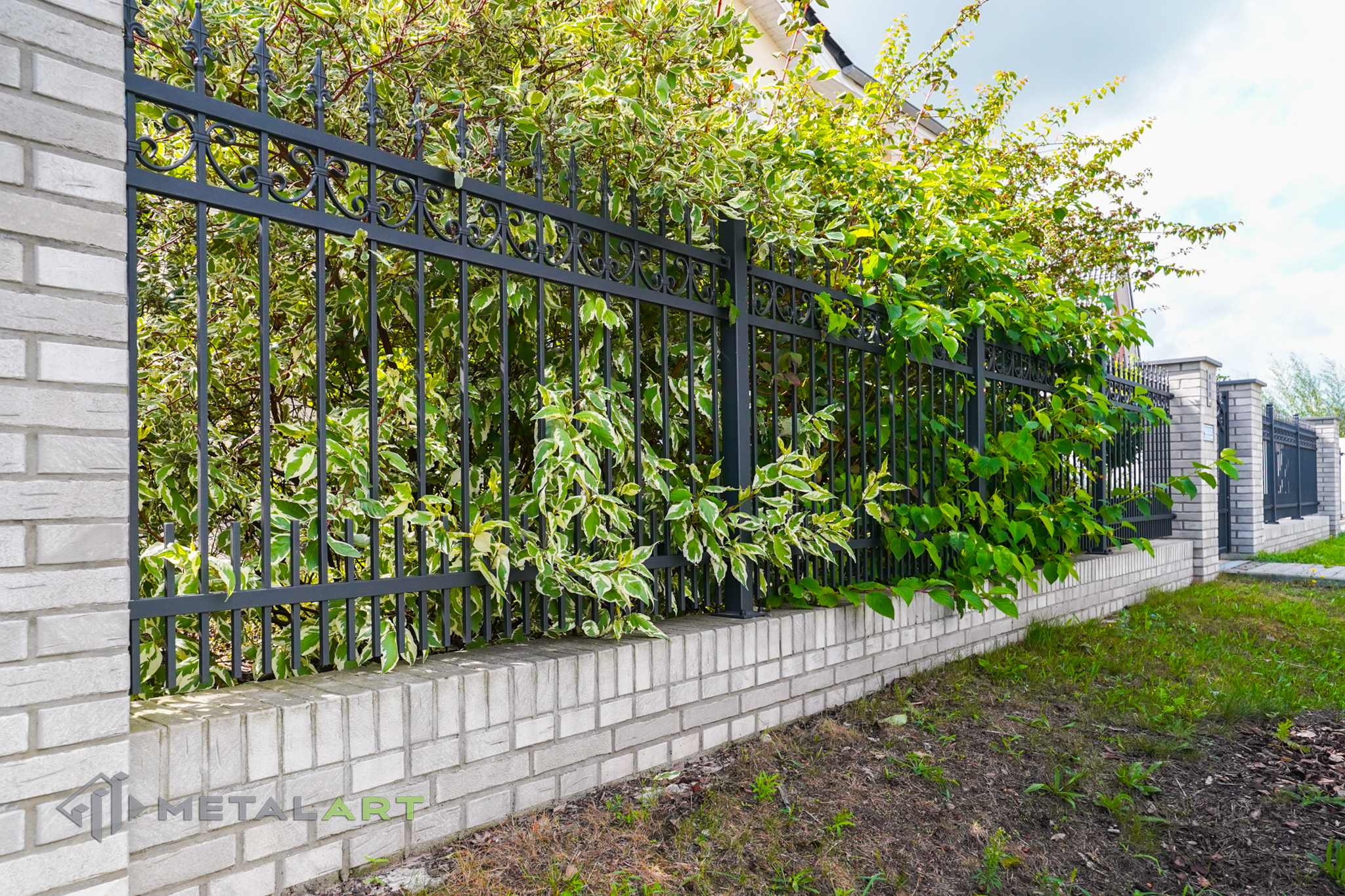 Bei diesem Projekt handelt es sich um eine klassische Lösung mit ein paar Ergänzungen wie zusätzlichen Querstreben, Verdickung des unteren Teils des Zauns mit zusätzlichen kurzen Stäben, kugelförmigen Kappen und Abschrägung der Stäben, die allesamt Stärke und Statik verleihen und gleichzeitig einen ruhigen und leichten Touch behalten.