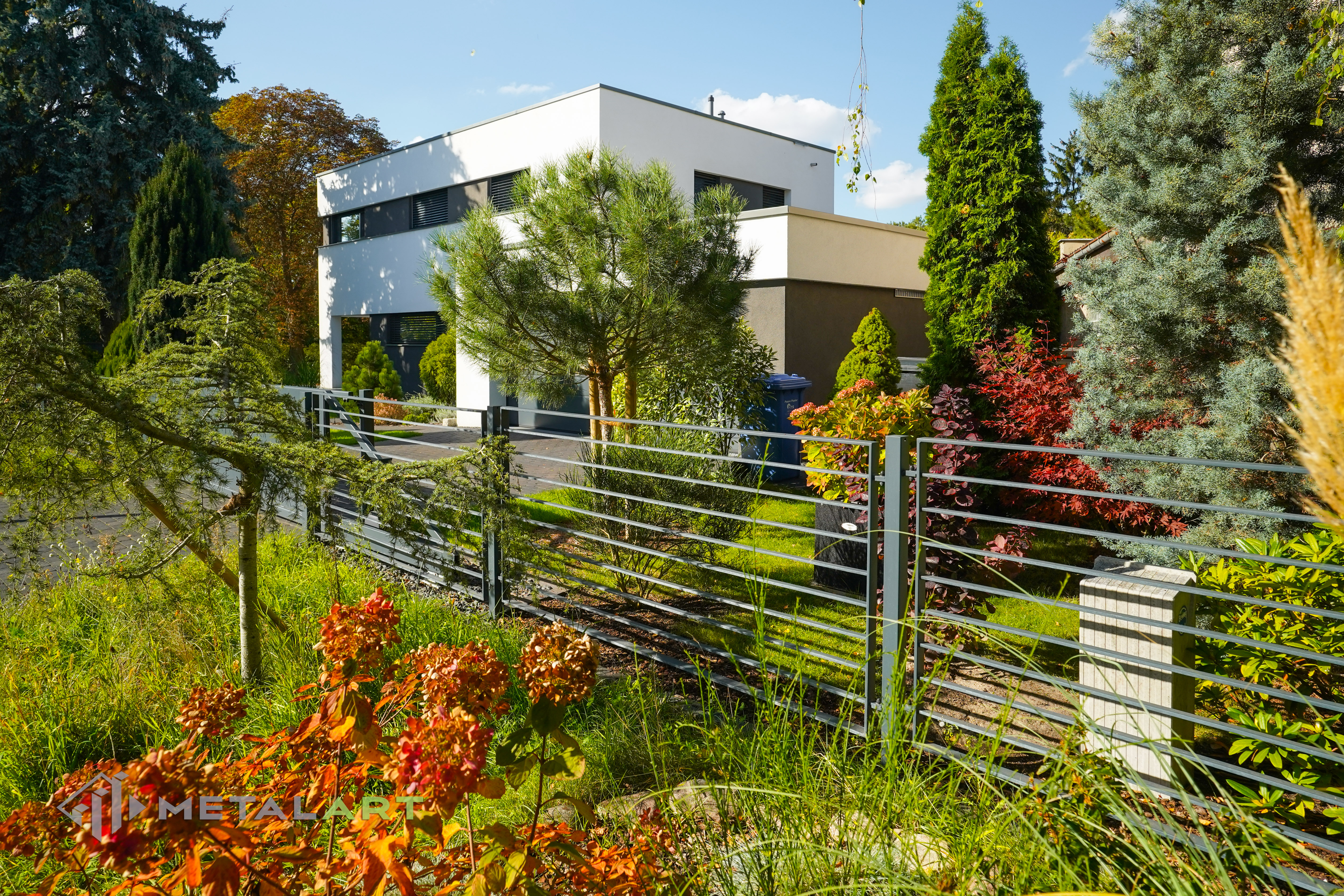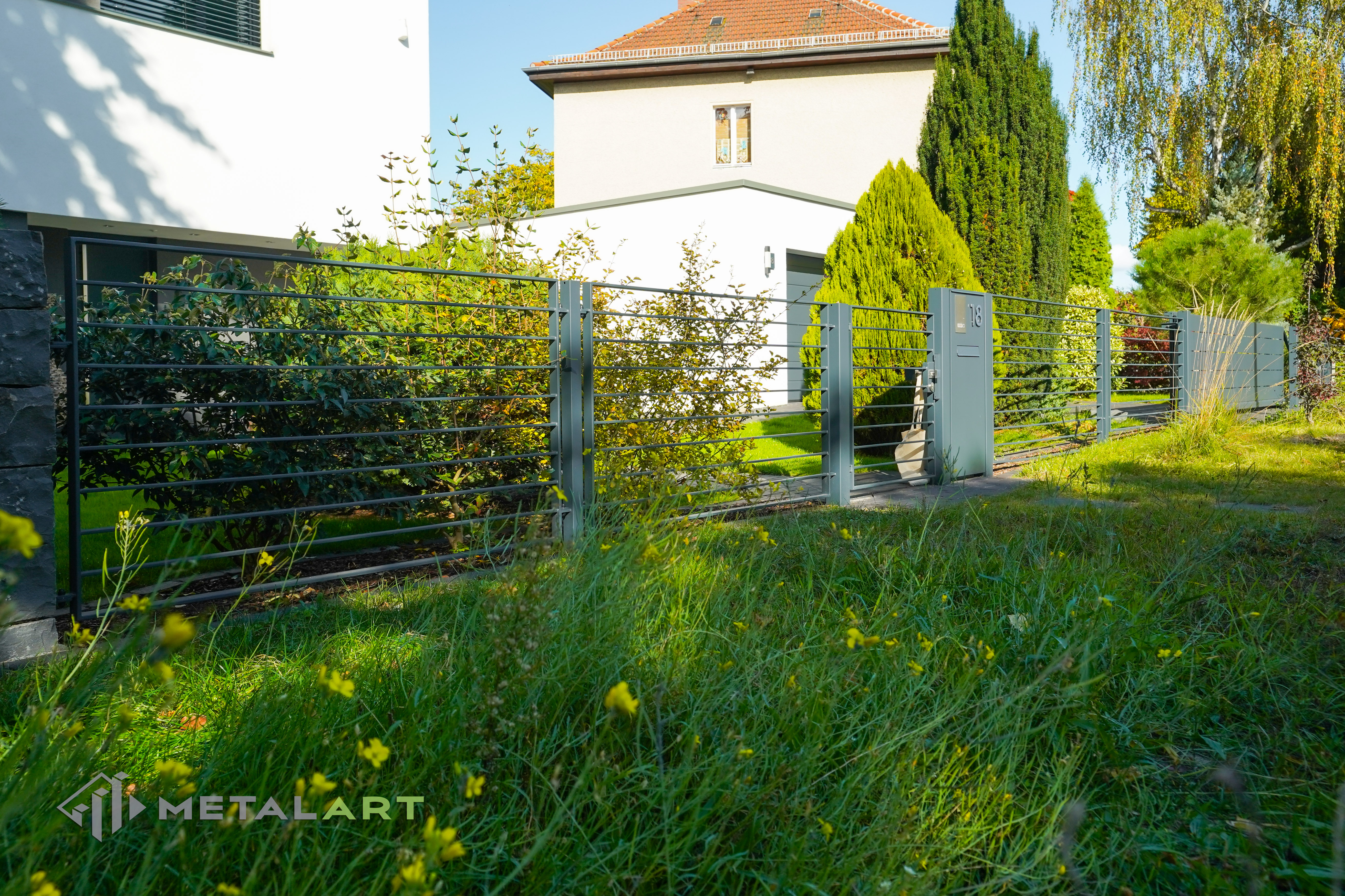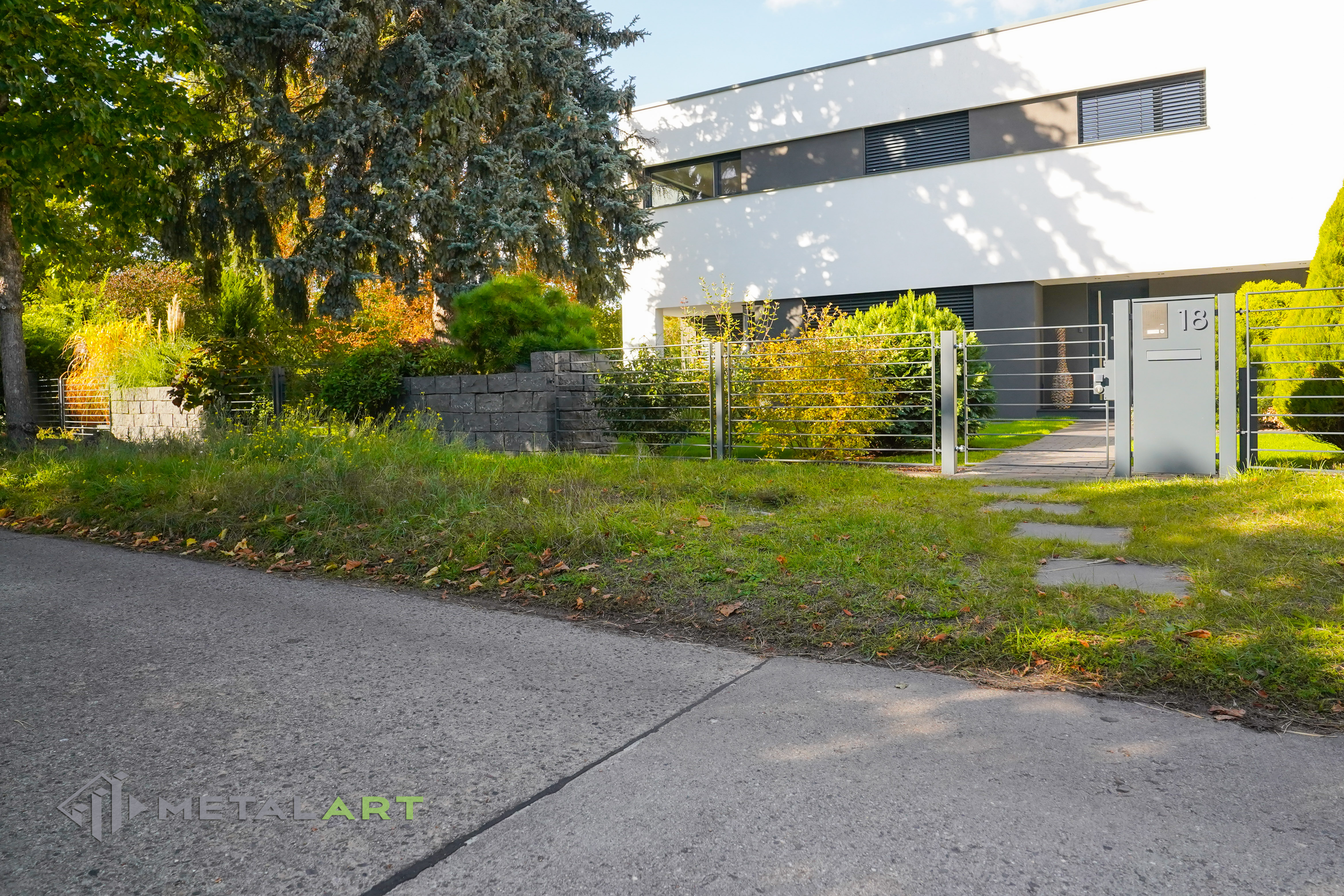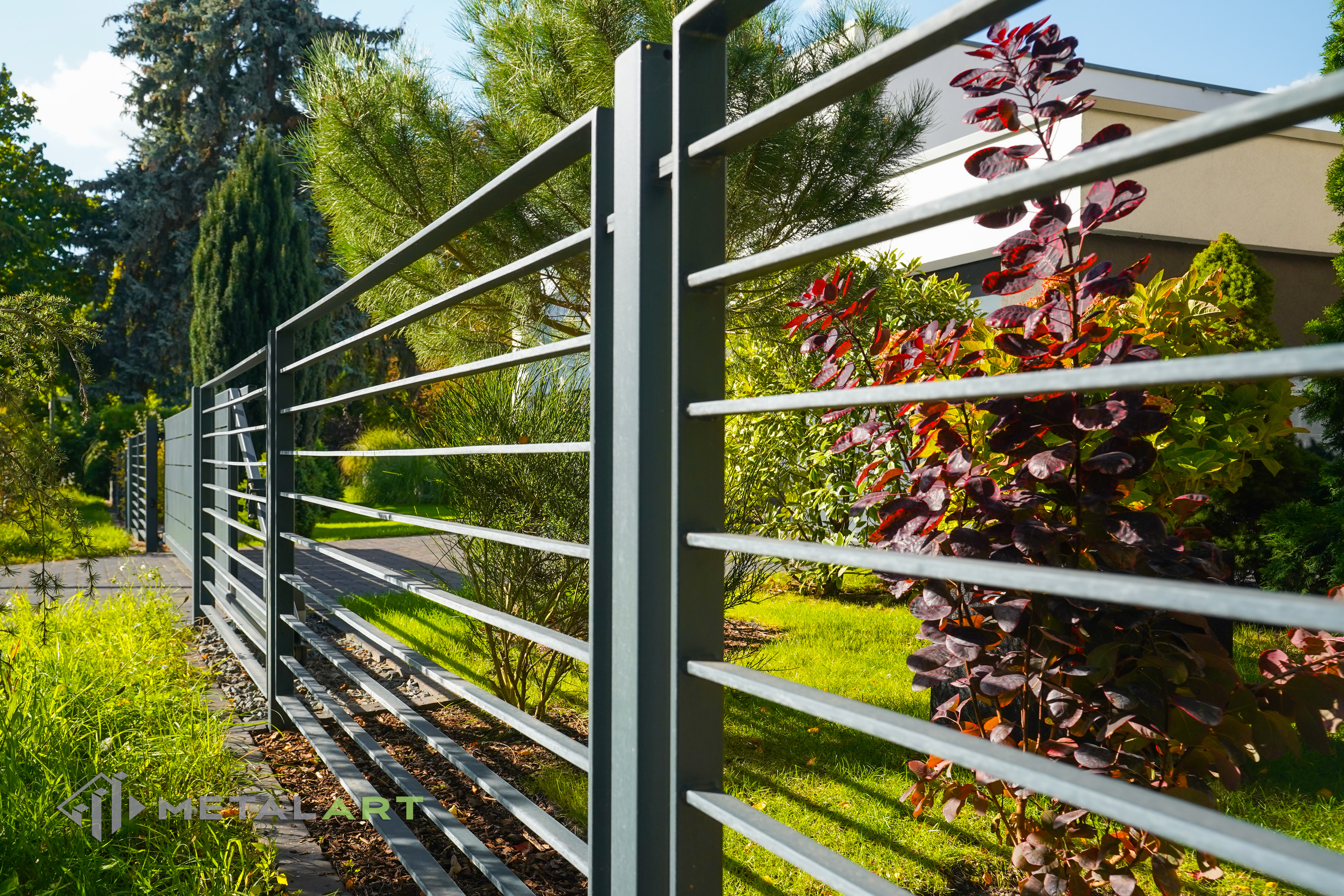 Dieses Zaunmodell harmoniert in seiner Grundform gut mit moderner Architektur. Es wird von Kunden gewählt, die Wert auf Einfachheit legen und den Raum deutlich hervorheben wollen. Die Größe, der Abstand und das Muster der Zaunfelder können frei bestimmt werden. Auch Farben, matt oder glänzend sind auf Anfrage erhältlich.