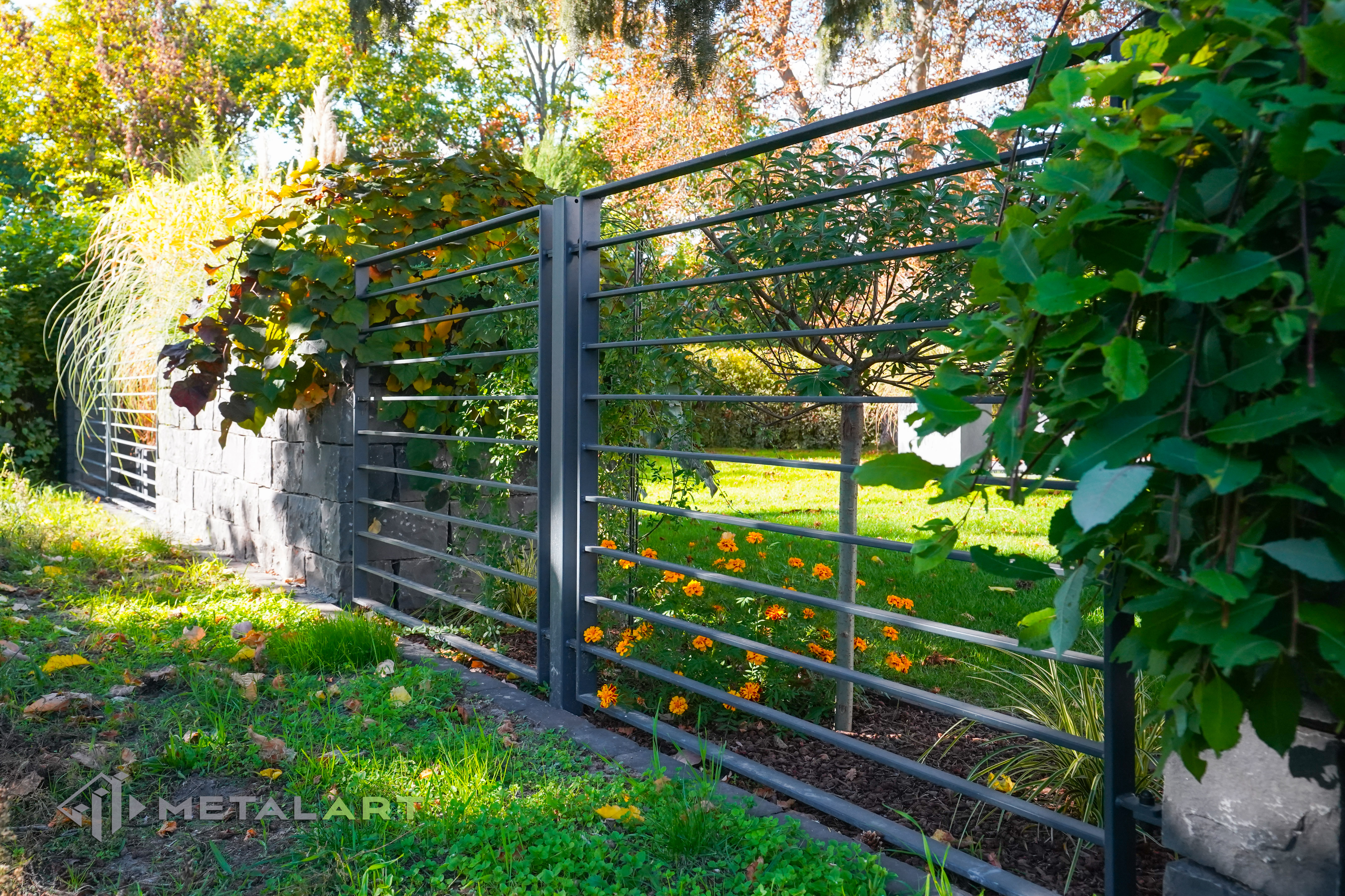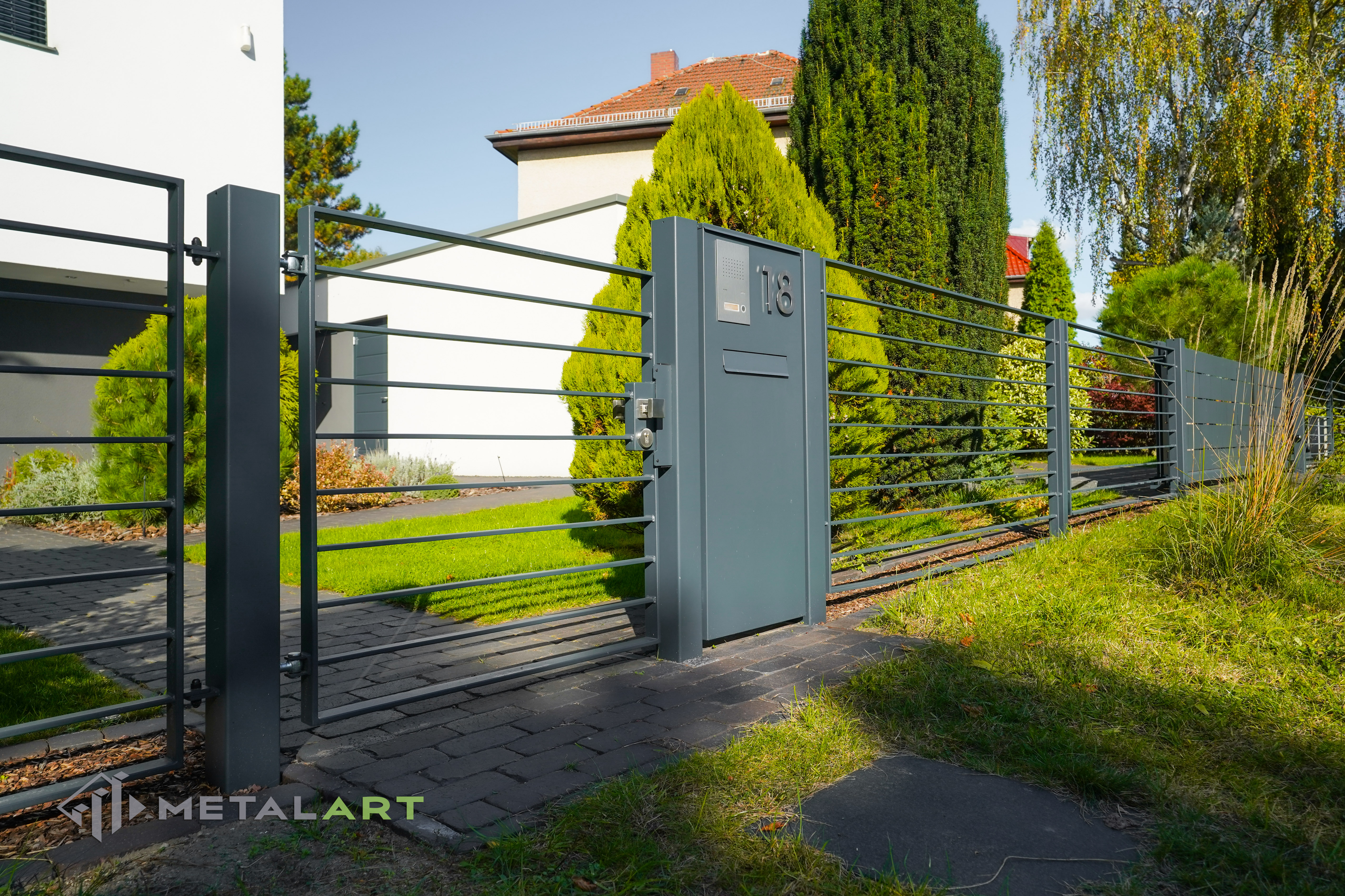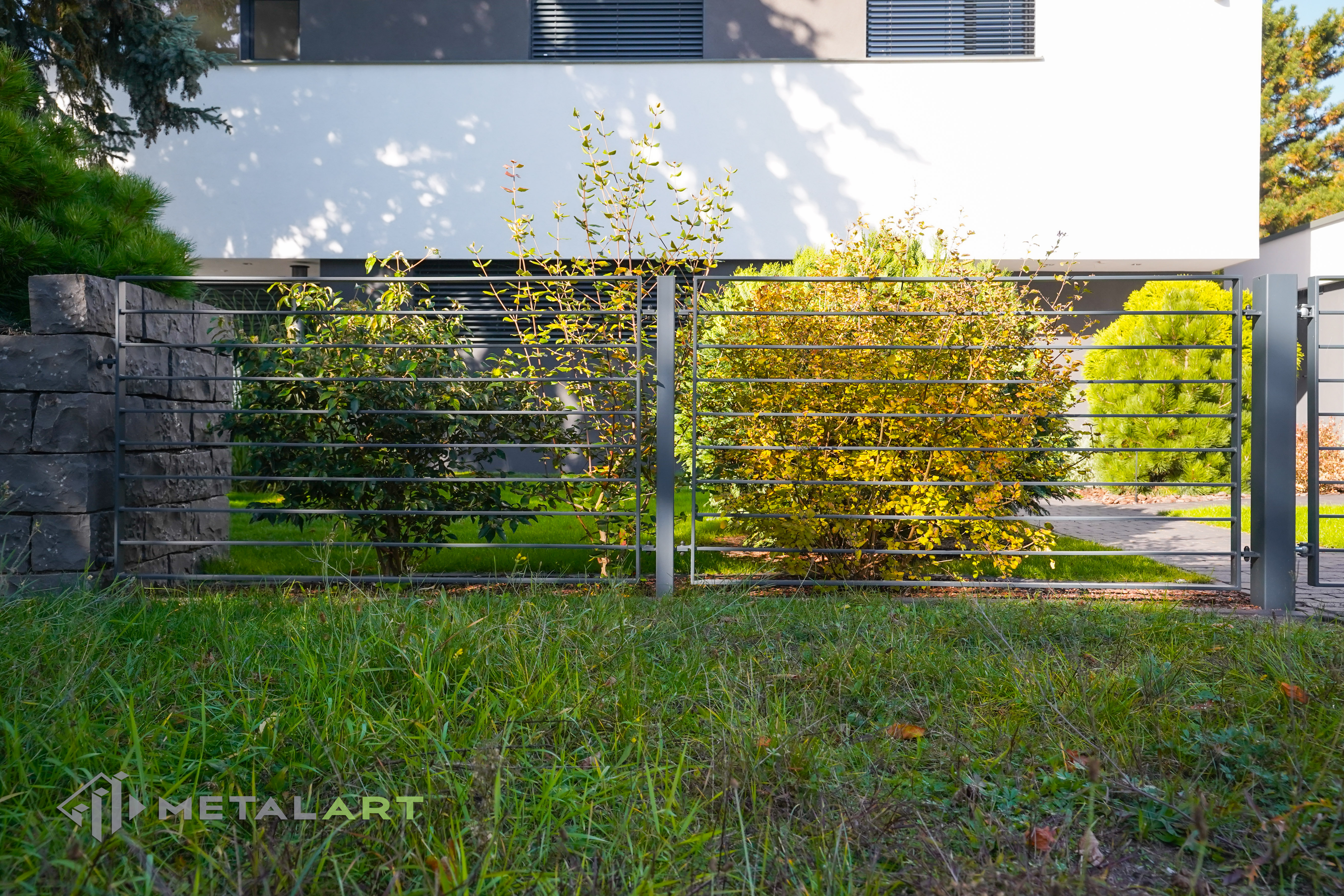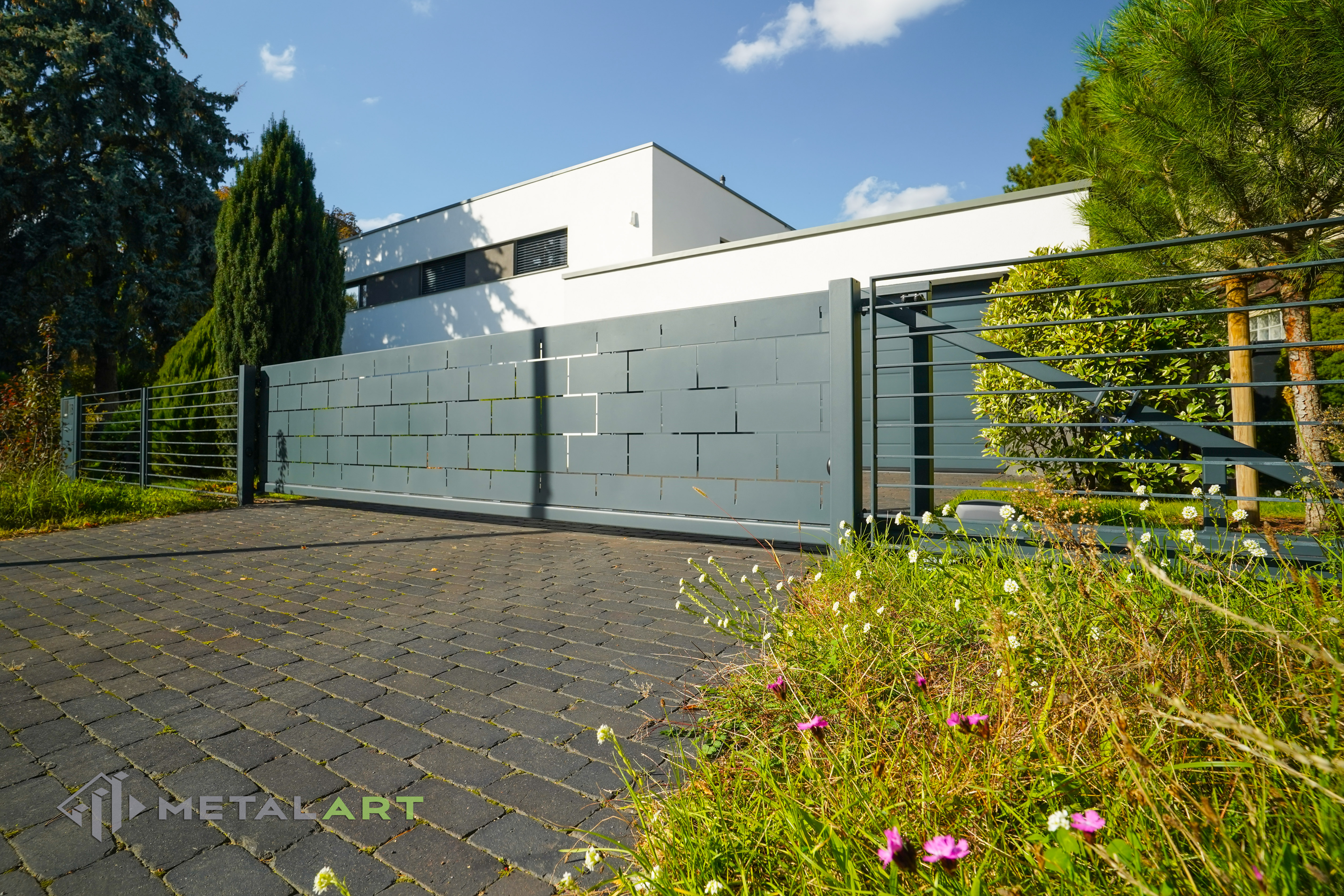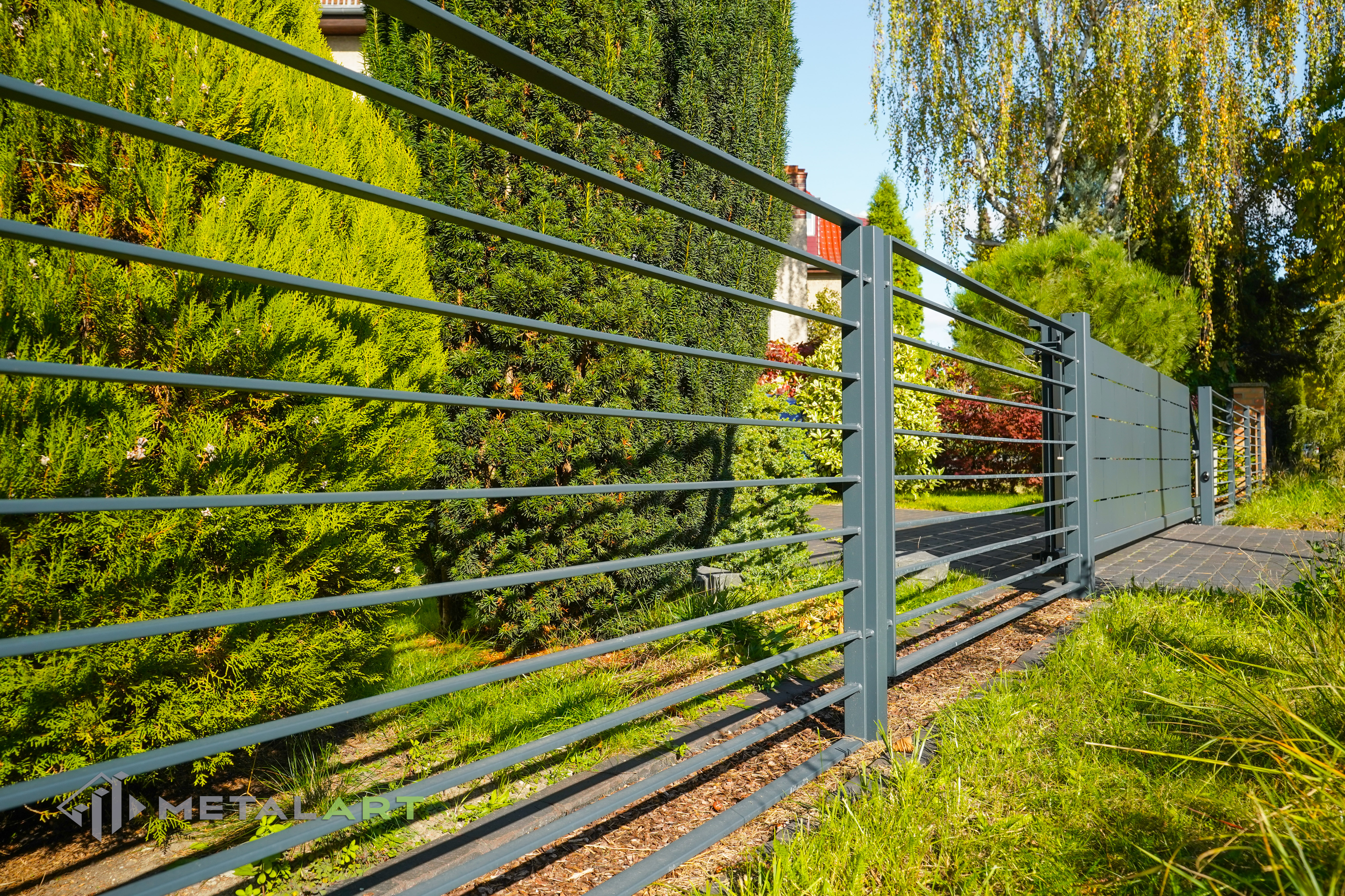 Dieses Zaunmodell harmoniert in seiner Grundform gut mit moderner Architektur. Es wird von Kunden gewählt, die Wert auf Einfachheit legen und den Raum deutlich hervorheben wollen. Die Größe, der Abstand und das Muster der Zaunfelder können frei bestimmt werden. Auch Farben, matt oder glänzend sind auf Anfrage erhältlich.