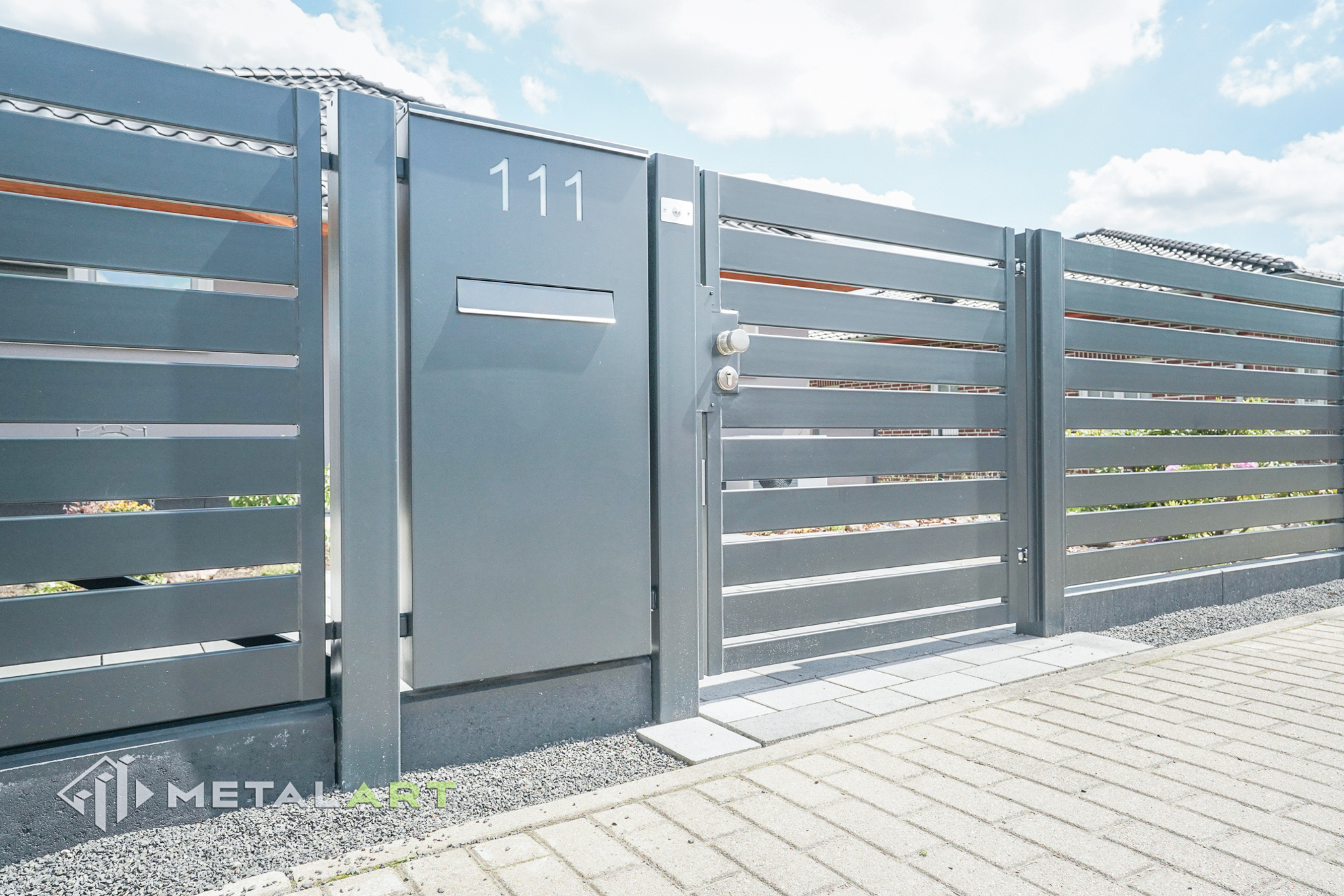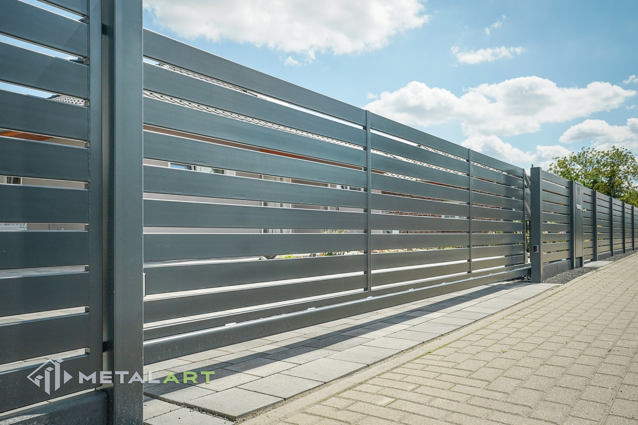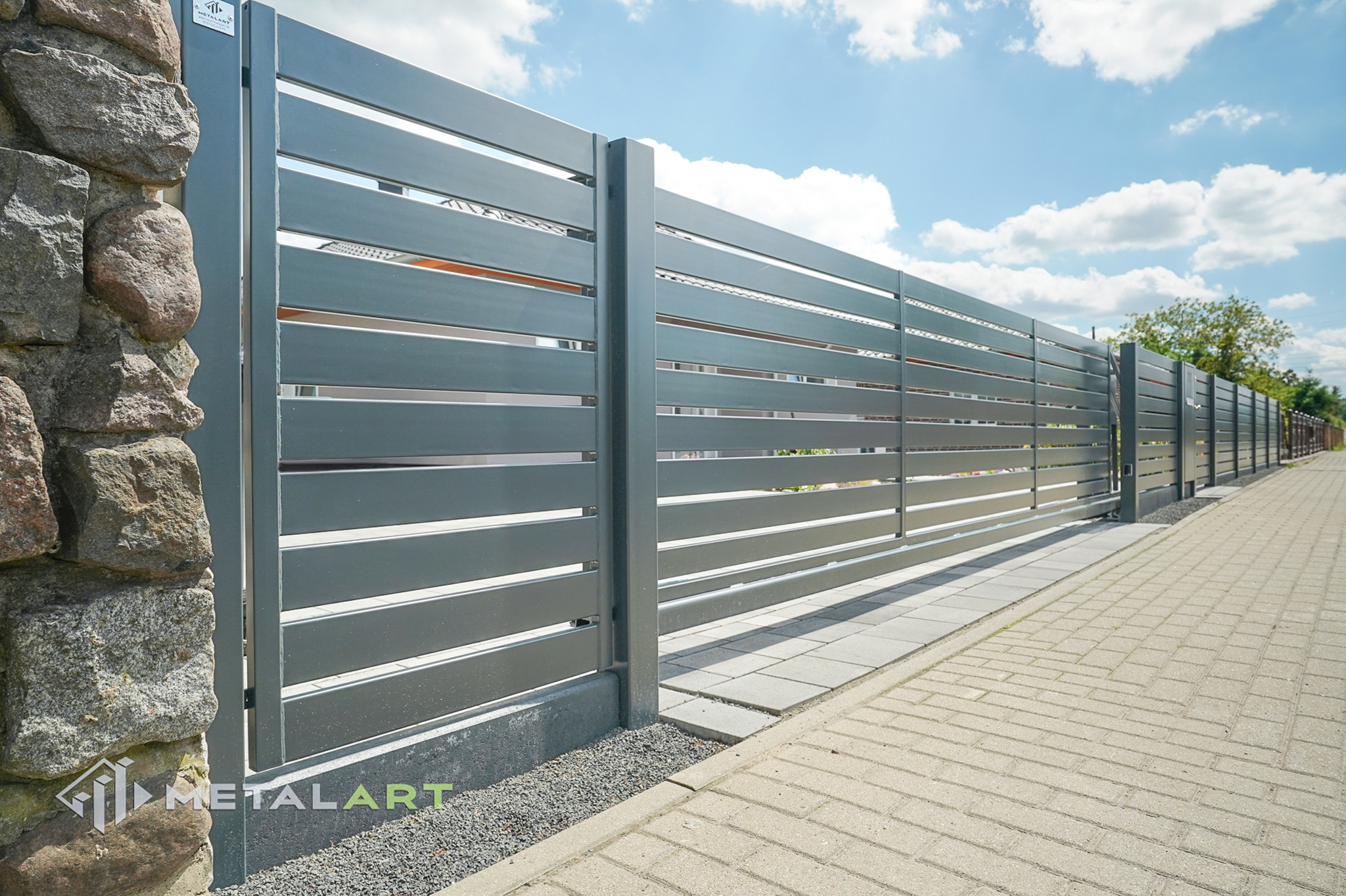 Das Schiebetor funktioniert in diesem Modell perfekt und unterstreicht mit seiner Bewegung den horizontalen Charakter des Zauns. Das Schiebetor ist eine der Varianten (neben dem einflügeligen und zweiflügeligen Drehtor), die wir Ihnen anbieten. Es hängt von Ihren individuellen Bedürfnissen ab, welche Art von Tor verwendet wird.