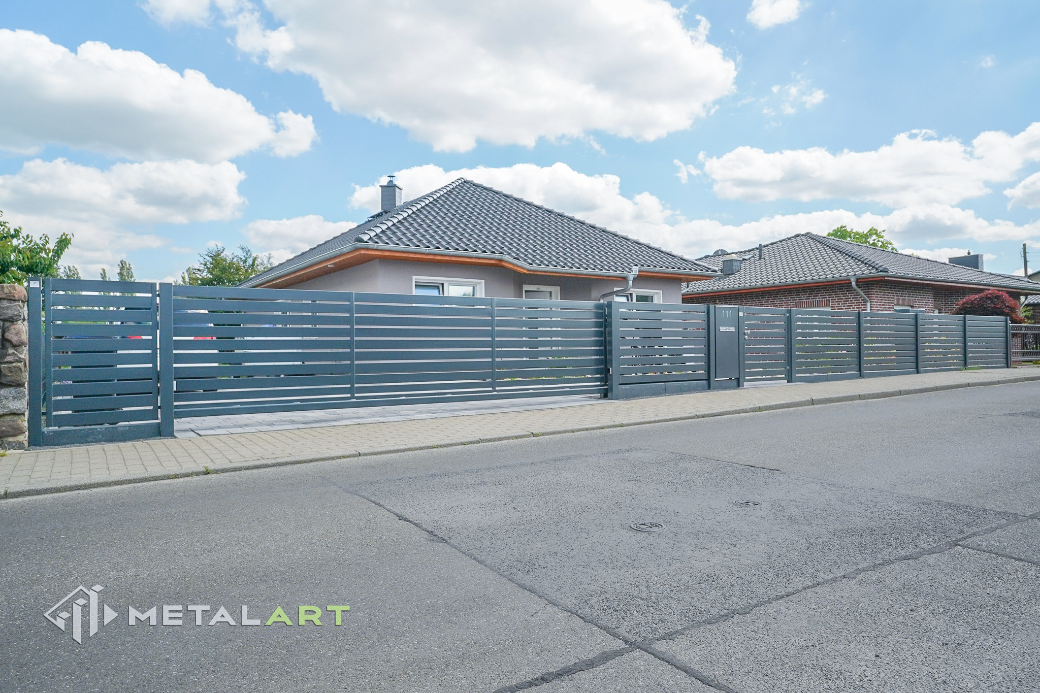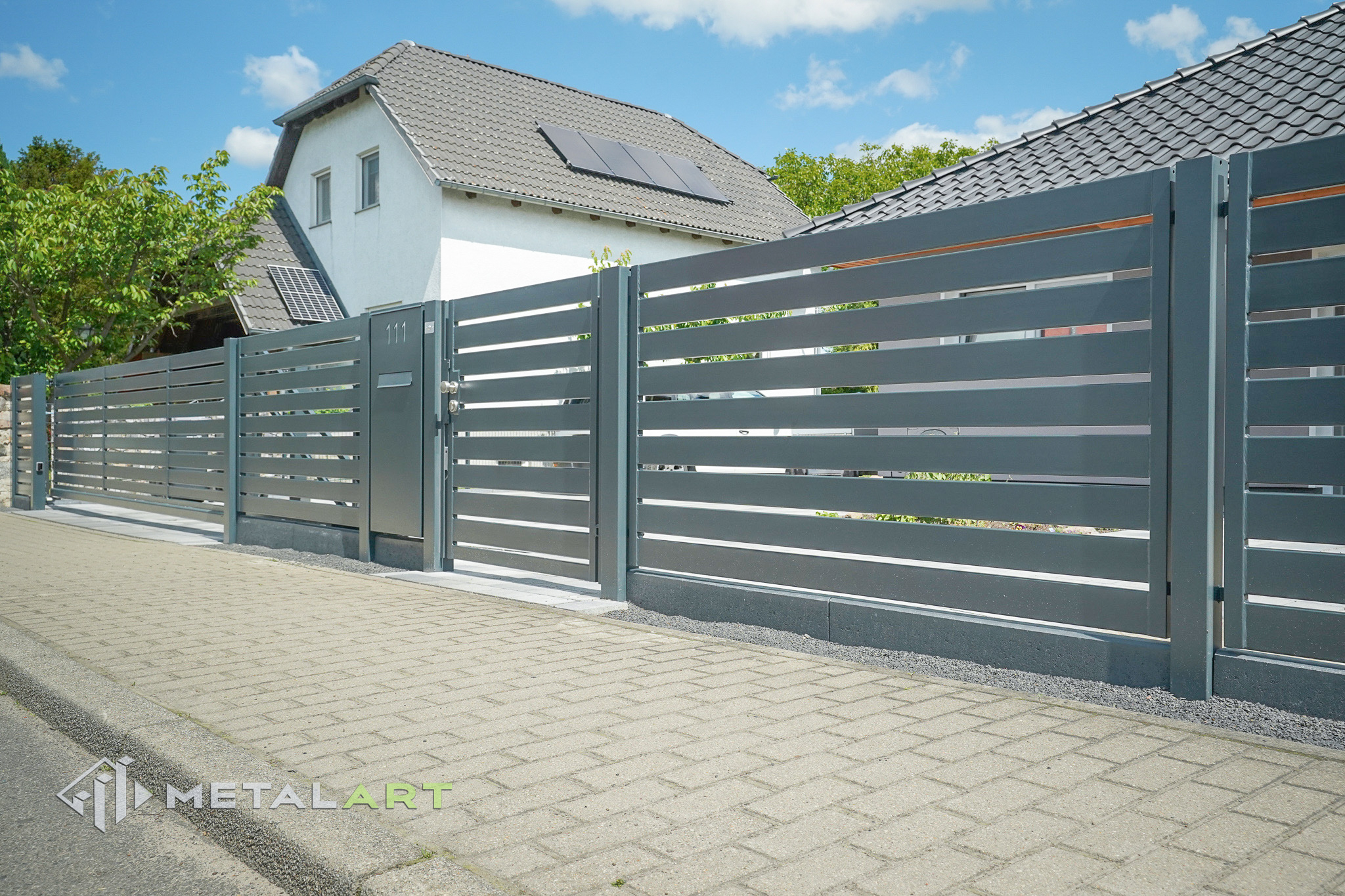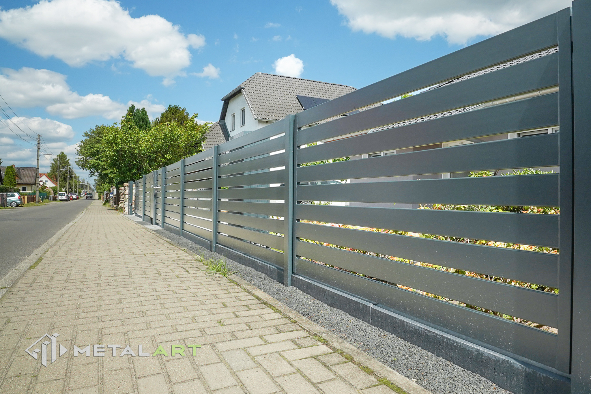 Das Schiebetor funktioniert in diesem Modell perfekt und unterstreicht mit seiner Bewegung den horizontalen Charakter des Zauns. Das Schiebetor ist eine der Varianten (neben dem einflügeligen und zweiflügeligen Drehtor), die wir Ihnen anbieten. Es hängt von Ihren individuellen Bedürfnissen ab, welche Art von Tor verwendet wird.