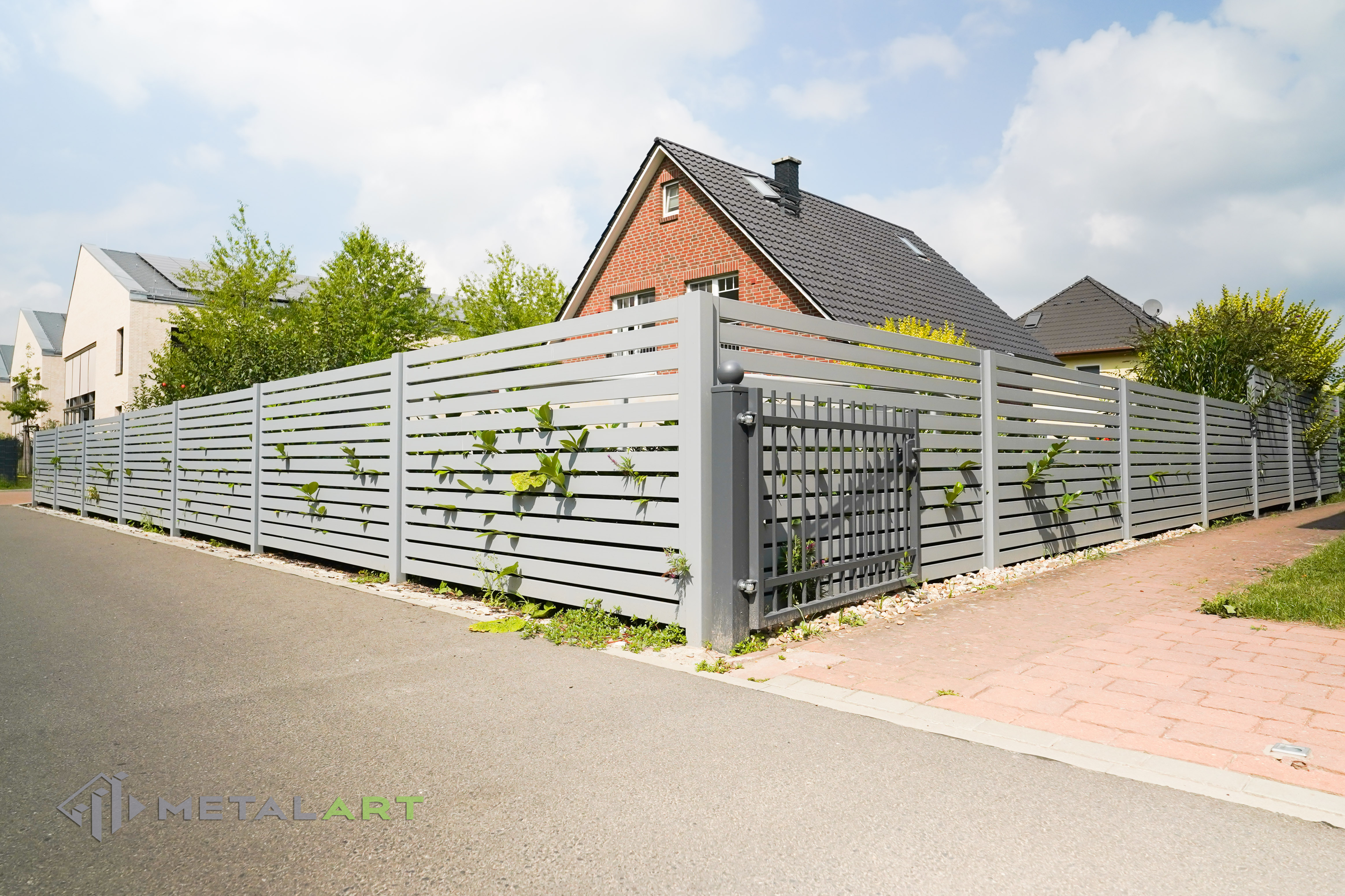 Dieses Zaunmodell harmoniert in seiner Grundform gut mit moderner Architektur. Es wird von Kunden gewählt, die Wert auf Einfachheit legen, den Raum deutlich hervorheben und die Sichtbarkeit begrenzen wollen.