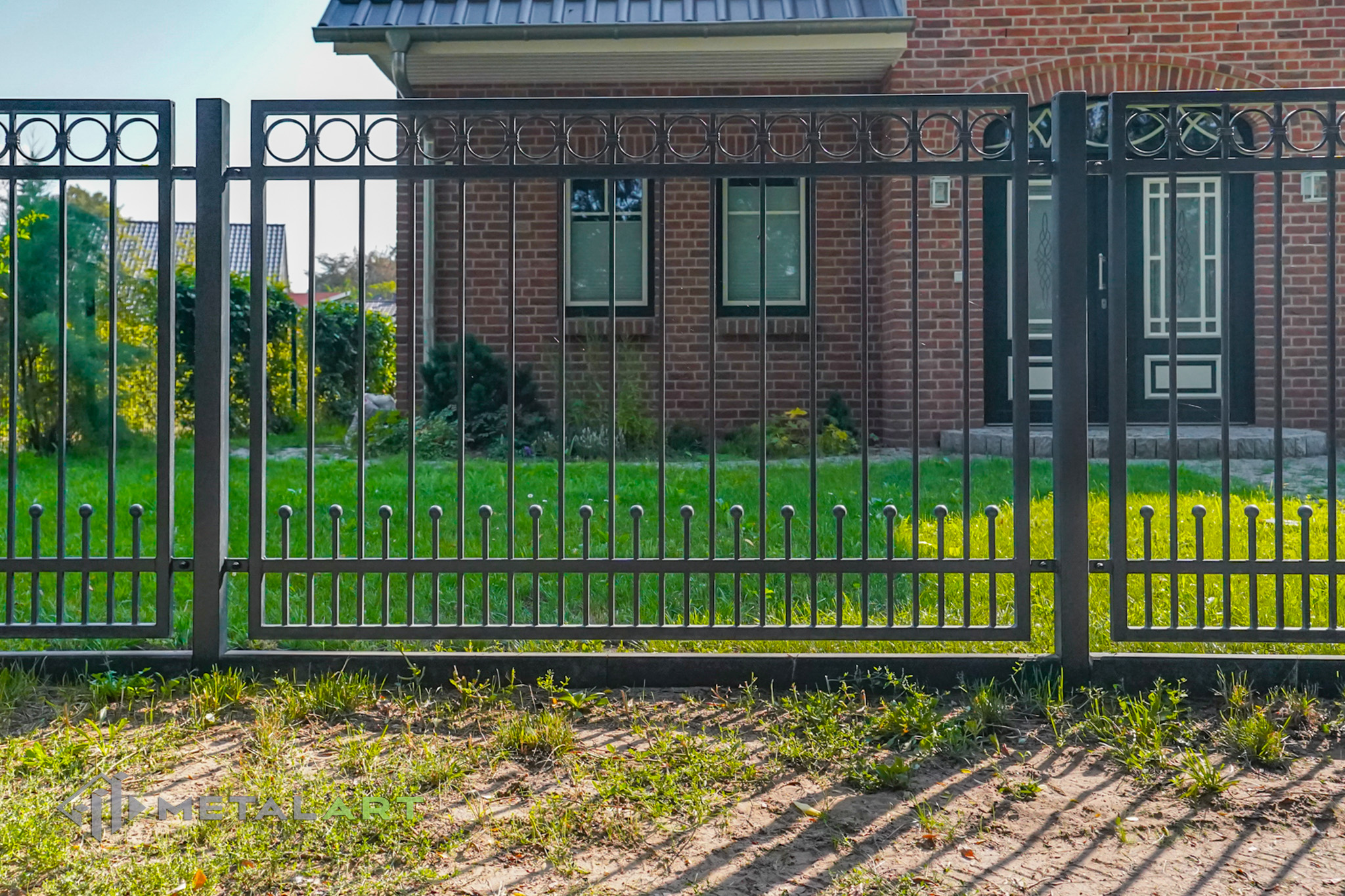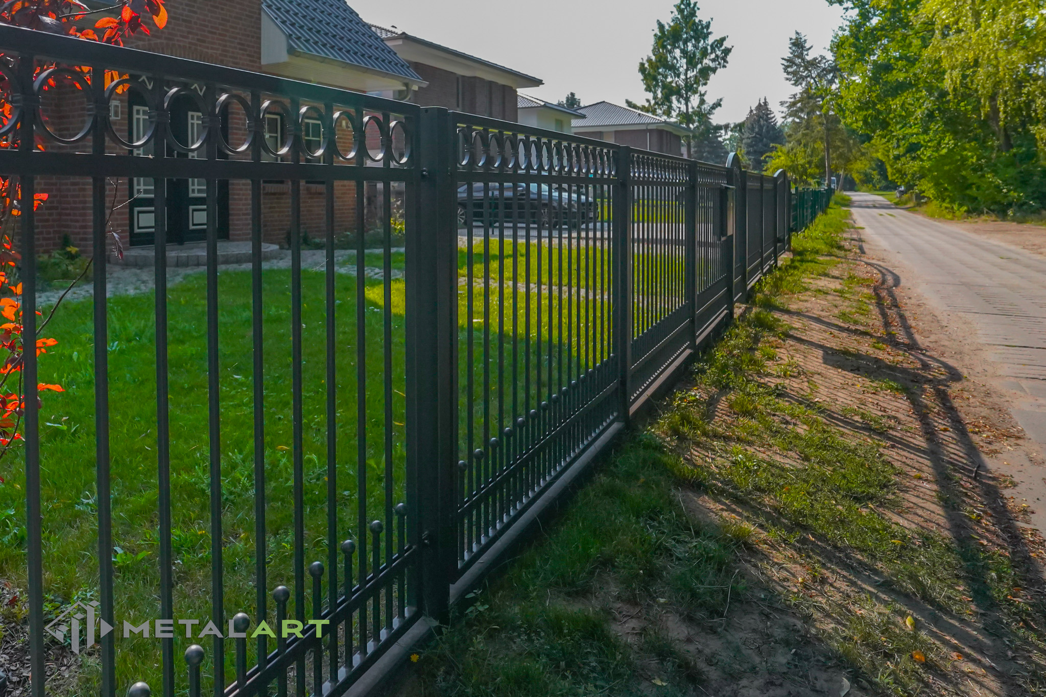 In diesem Projekt wurde der obere und untere Teil des Zauns dekoriert. Gerade Linien sind das dominierende Element, das das Zaunfeld verdickt, und das Ganze wird mit einem anmutigen Ornament auf der Oberseite abgeschlossen. Die Zaunkappen verleihen dem Zaun Erhabenheit und ordnen gleichzeitig die Vielzahl der hier verwendeten Ornamente. Ein wirklich schöner Zaun!