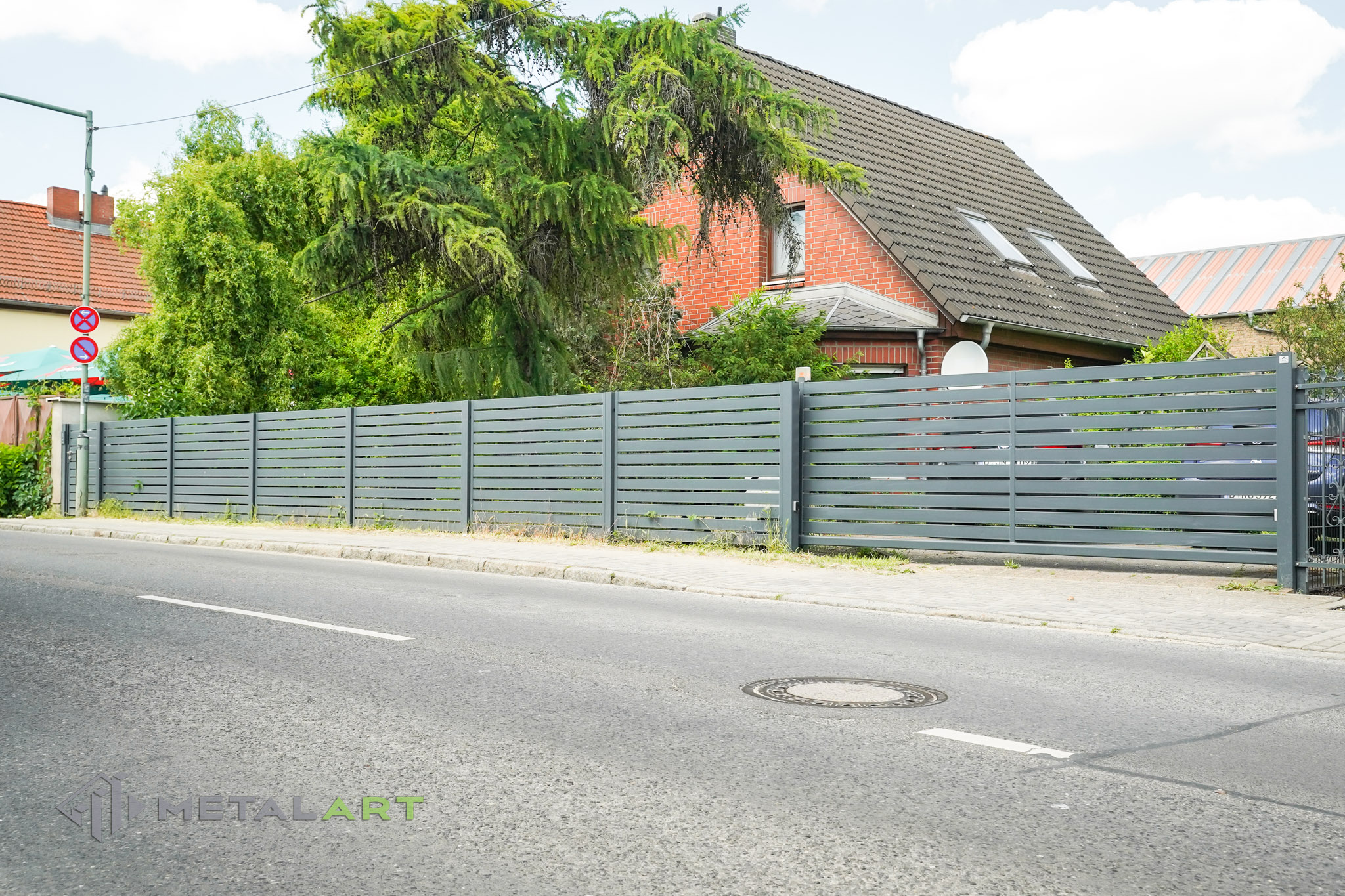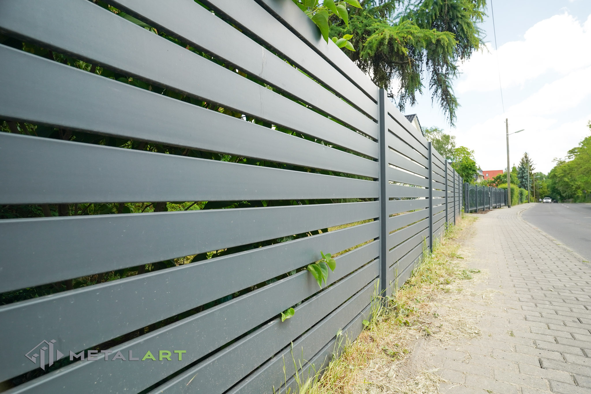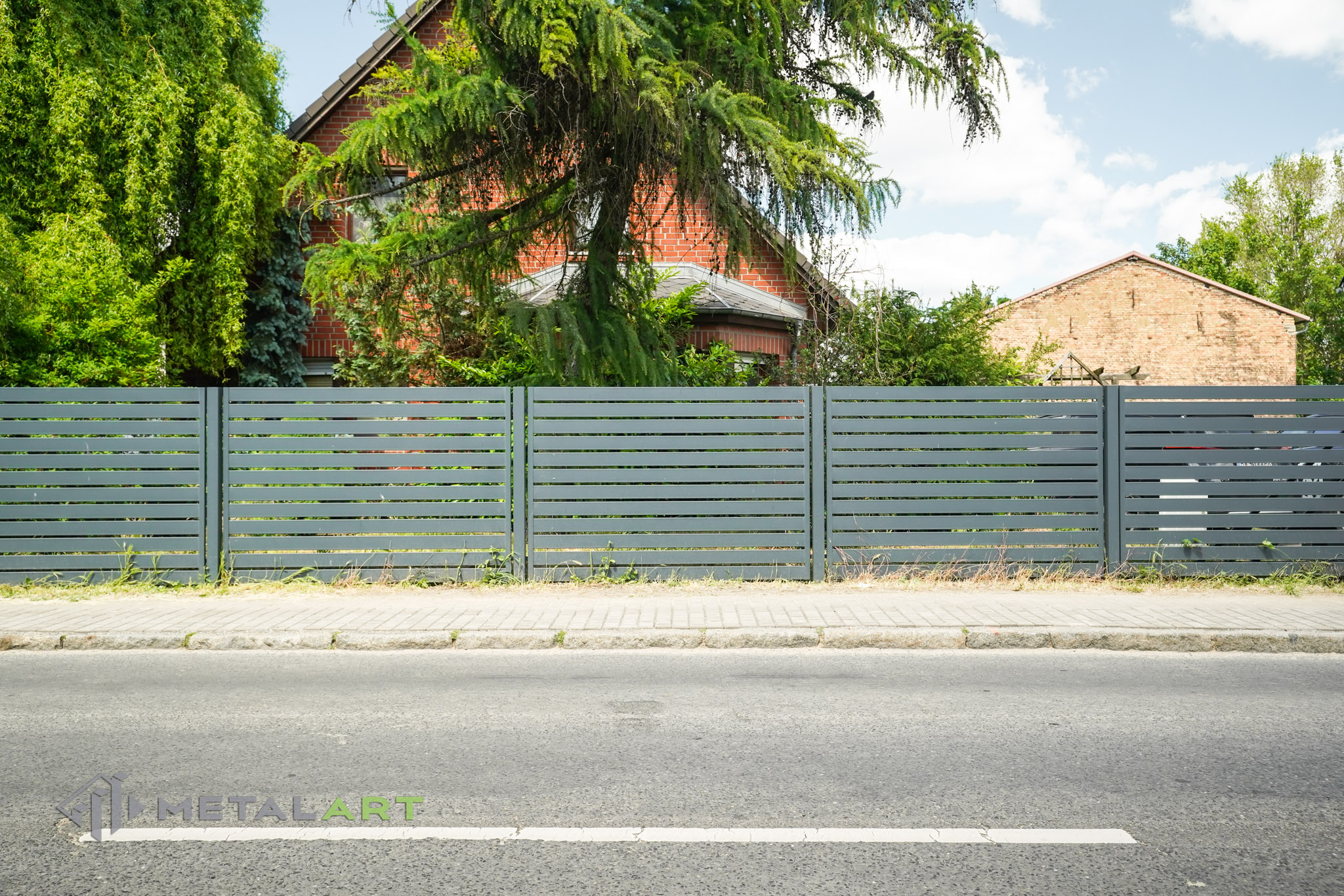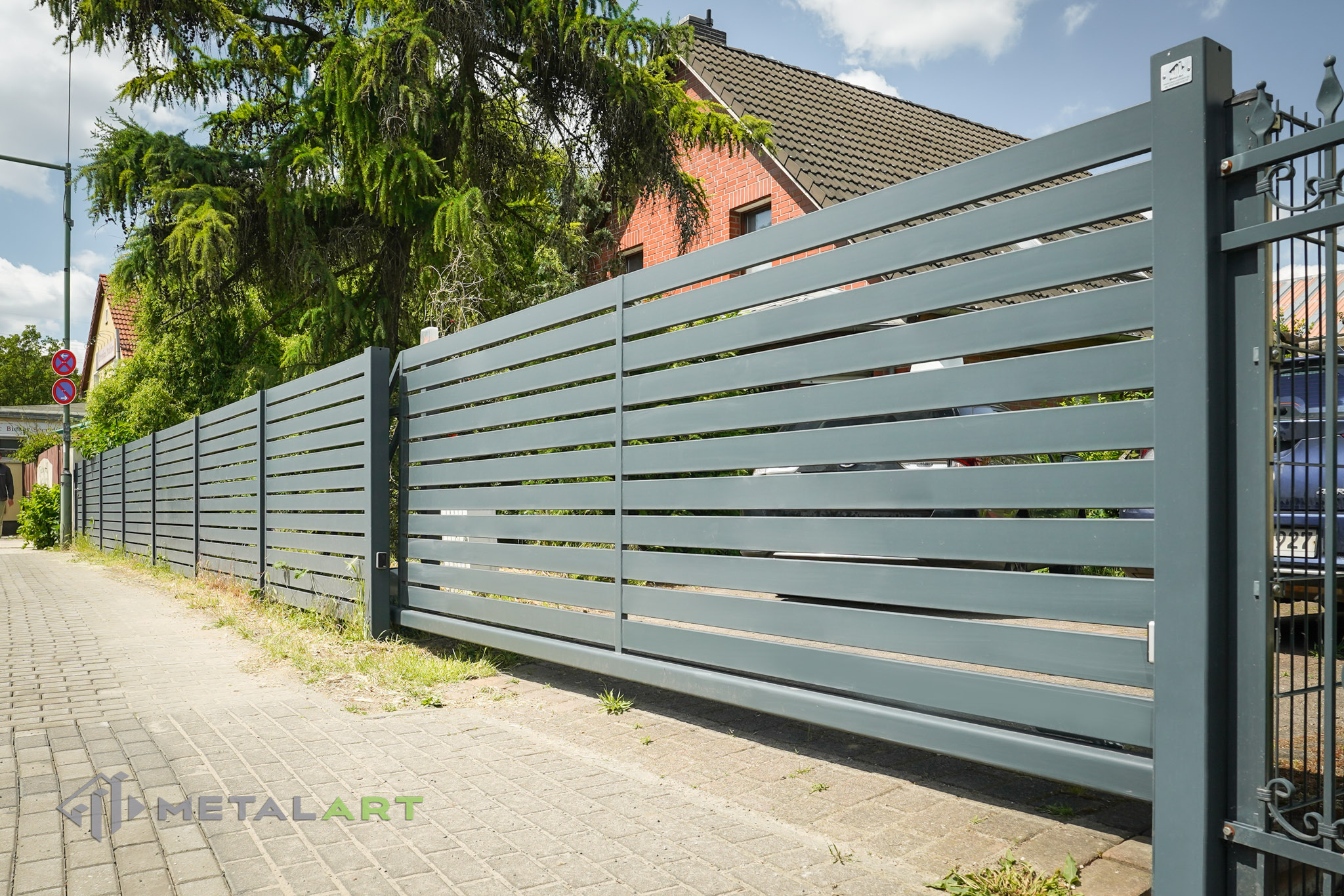 Das Schiebetor funktioniert in diesem Modell perfekt und unterstreicht mit seiner Bewegung den horizontalen Charakter des Zauns. Das Schiebetor ist eine der Varianten (neben dem einflügeligen und zweiflügeligen Drehtor), die wir Ihnen anbieten. Es hängt von Ihren individuellen Bedürfnissen ab, welche Art von Tor verwendet wird.
