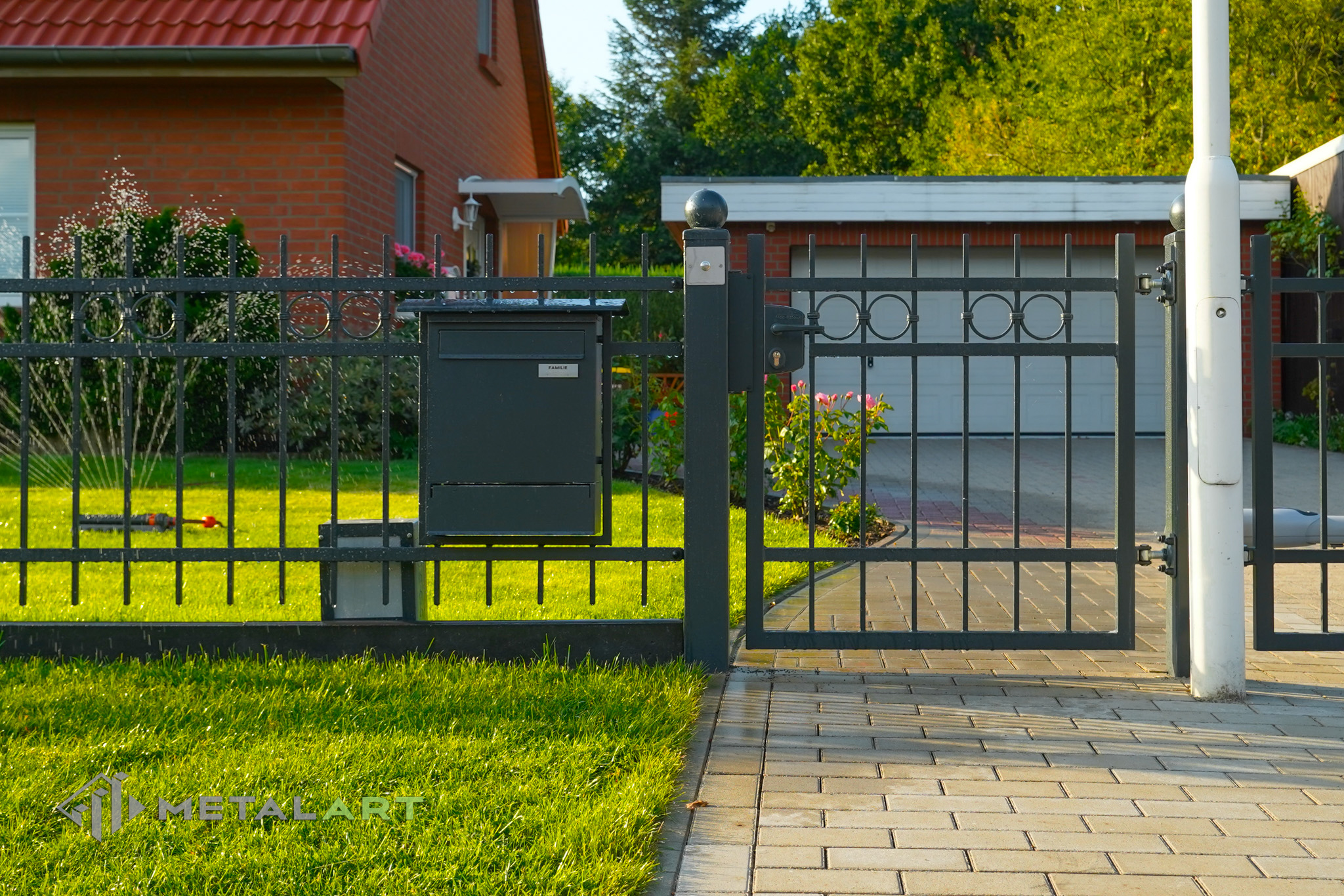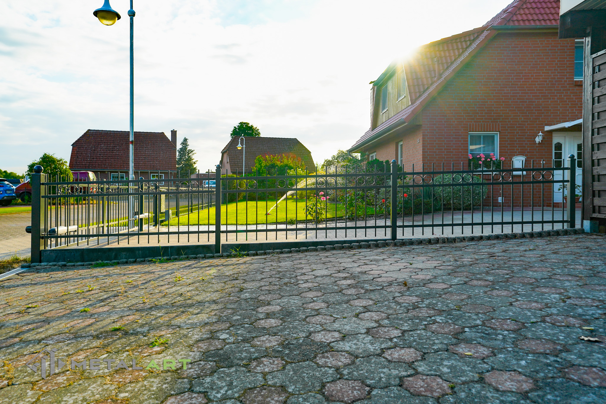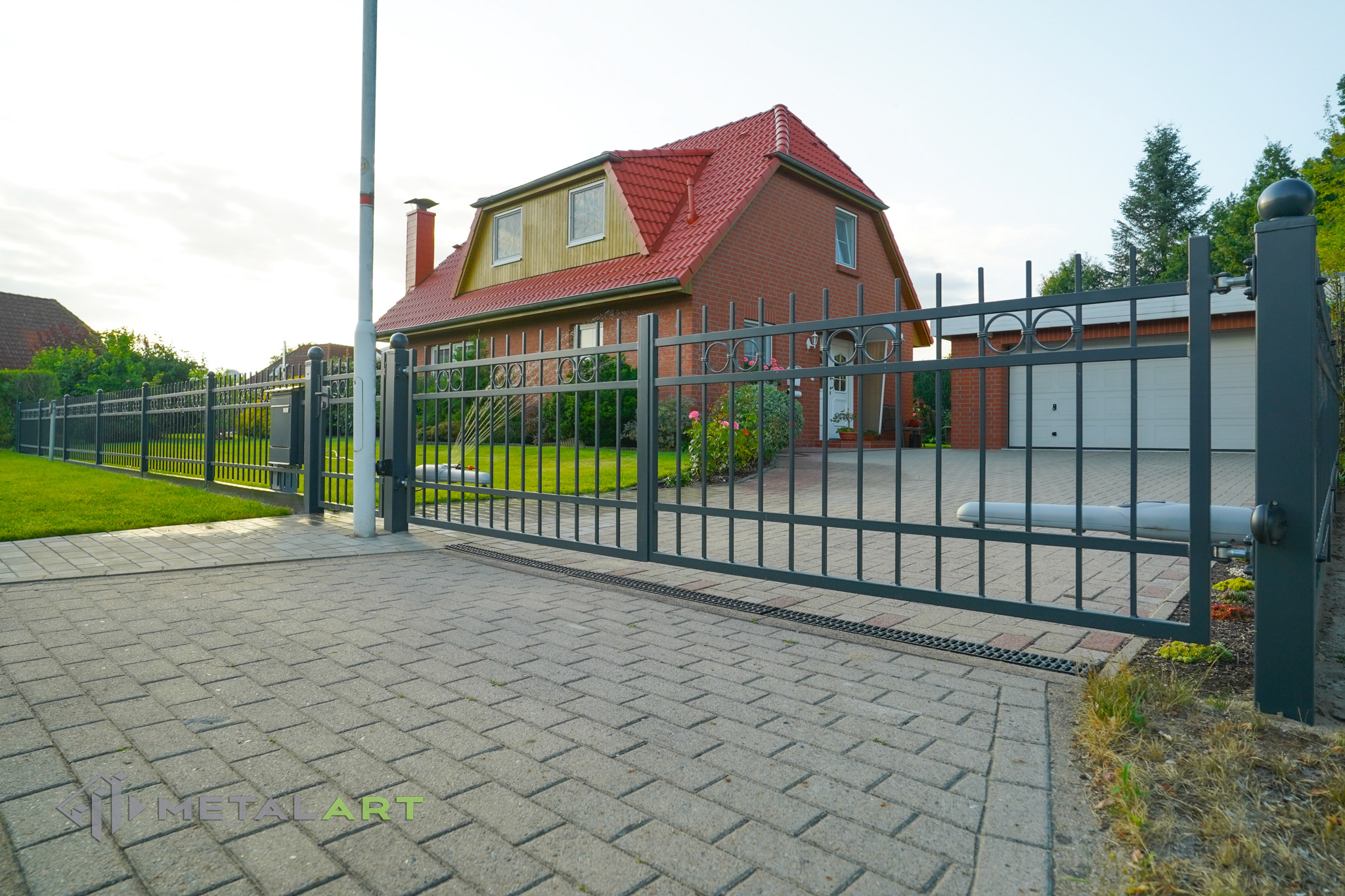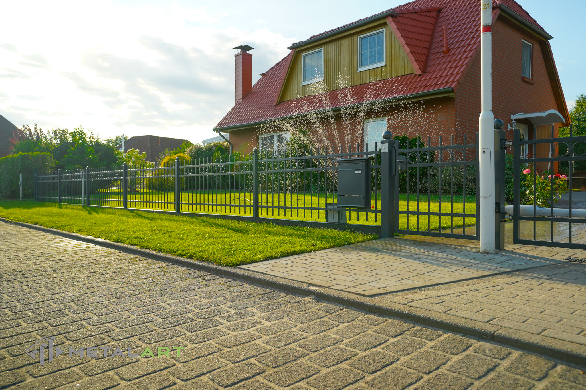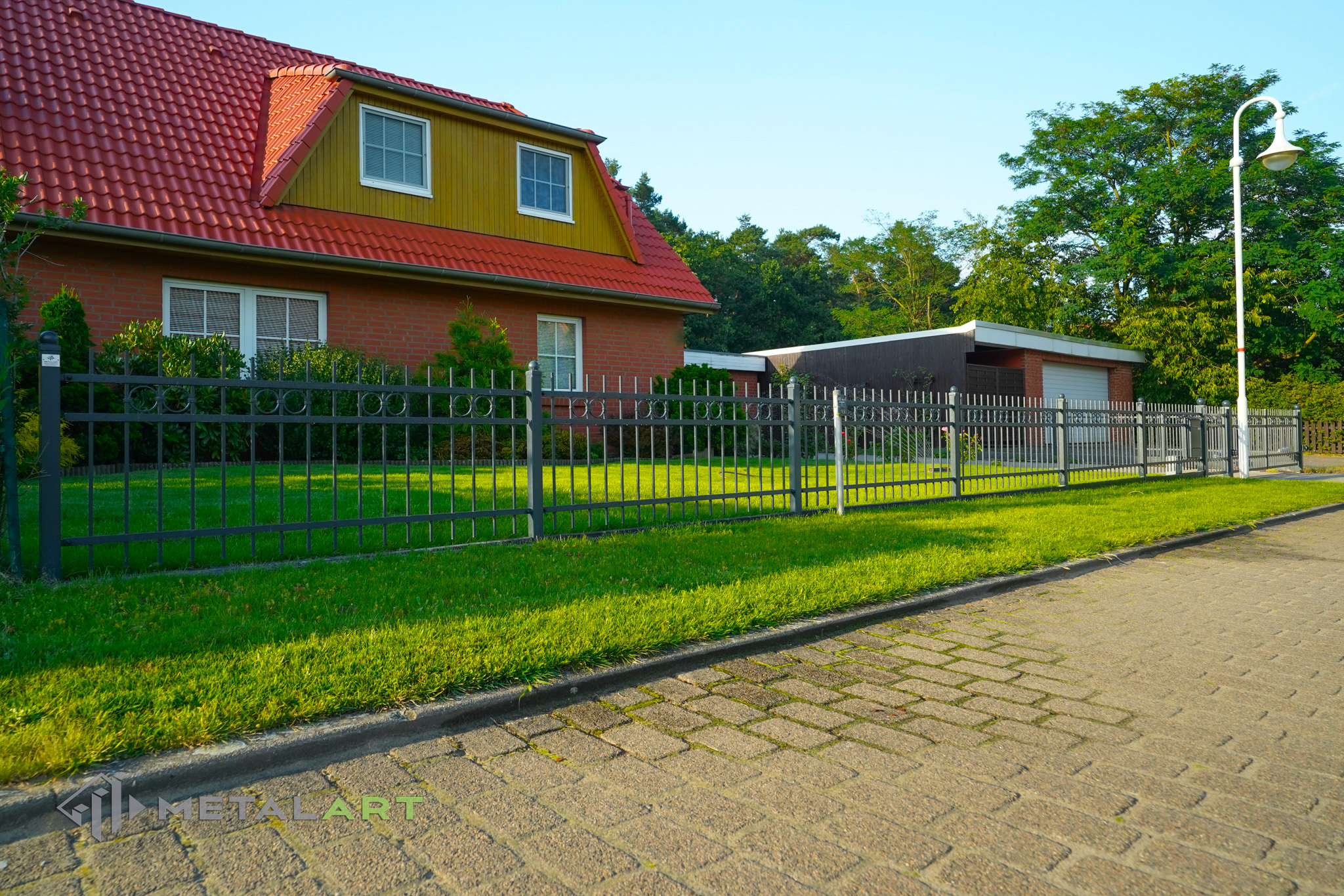 In diesem Projekt wurde der obere und untere Teil des Zauns dekoriert. Gerade Linien sind das dominierende Element, das das Zaunfeld verdickt, und das Ganze wird mit einem anmutigen Ornament auf der Oberseite abgeschlossen. Die Zaunkappen verleihen dem Zaun Erhabenheit und ordnen gleichzeitig die Vielzahl der hier verwendeten Ornamente. Ein wirklich schöner Zaun!