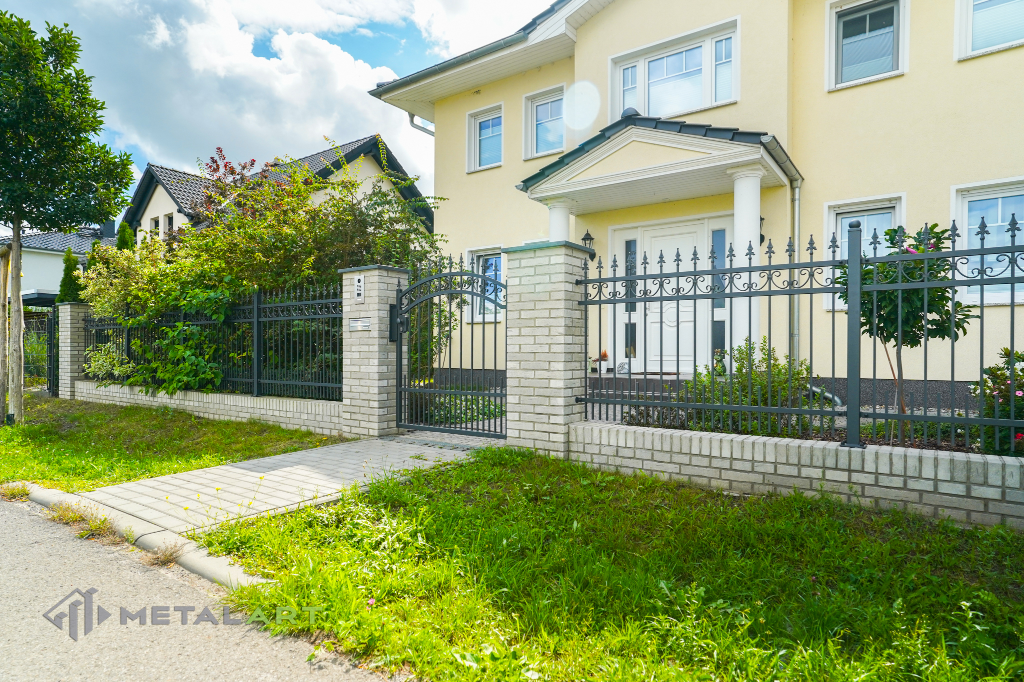 Bei diesem Projekt handelt es sich um eine klassische Lösung mit ein paar Ergänzungen wie zusätzlichen Querstreben, Verdickung des unteren Teils des Zauns mit zusätzlichen kurzen Stäben, kugelförmigen Kappen und Abschrägung der Stäben, die allesamt Stärke und Statik verleihen und gleichzeitig einen ruhigen und leichten Touch behalten.