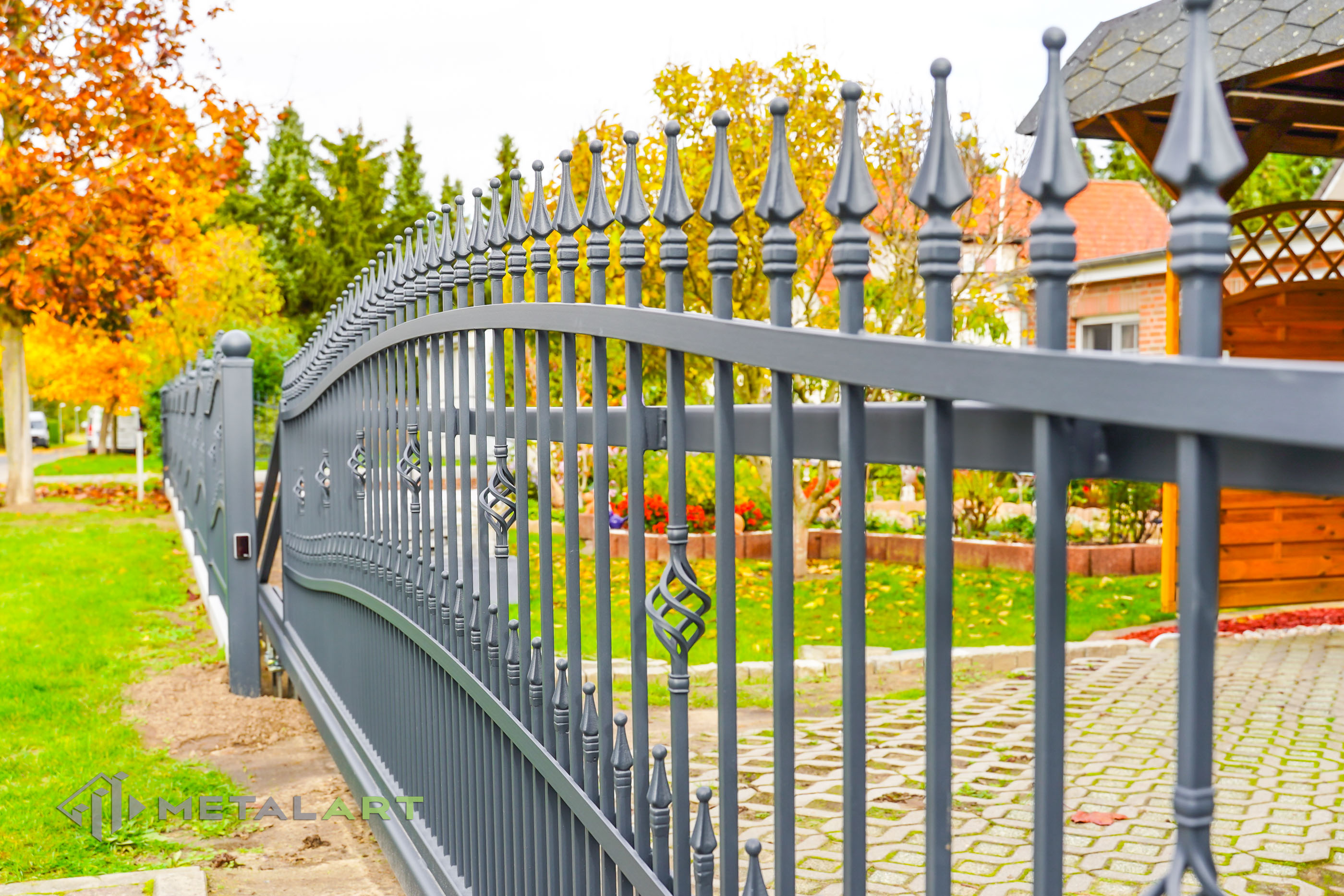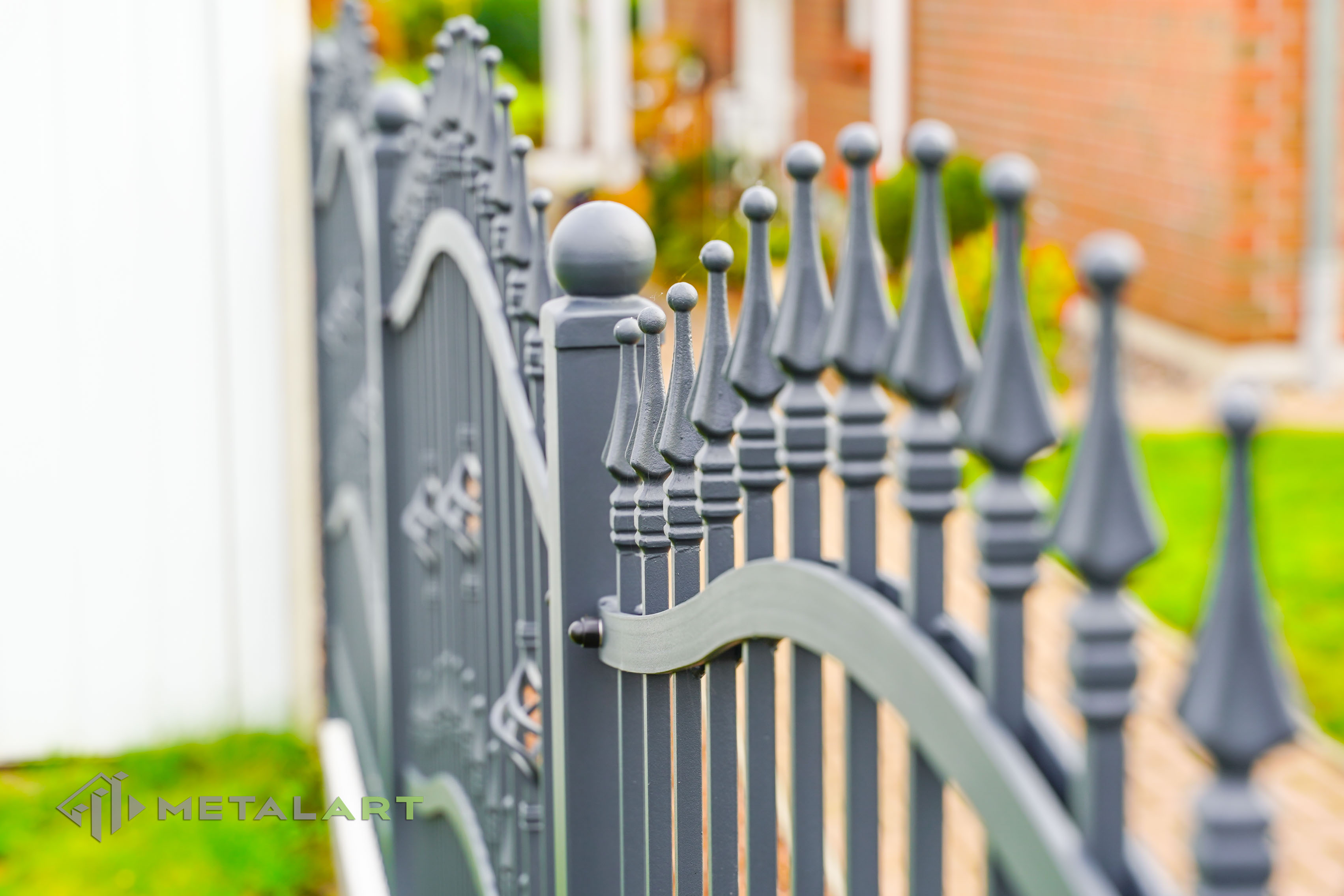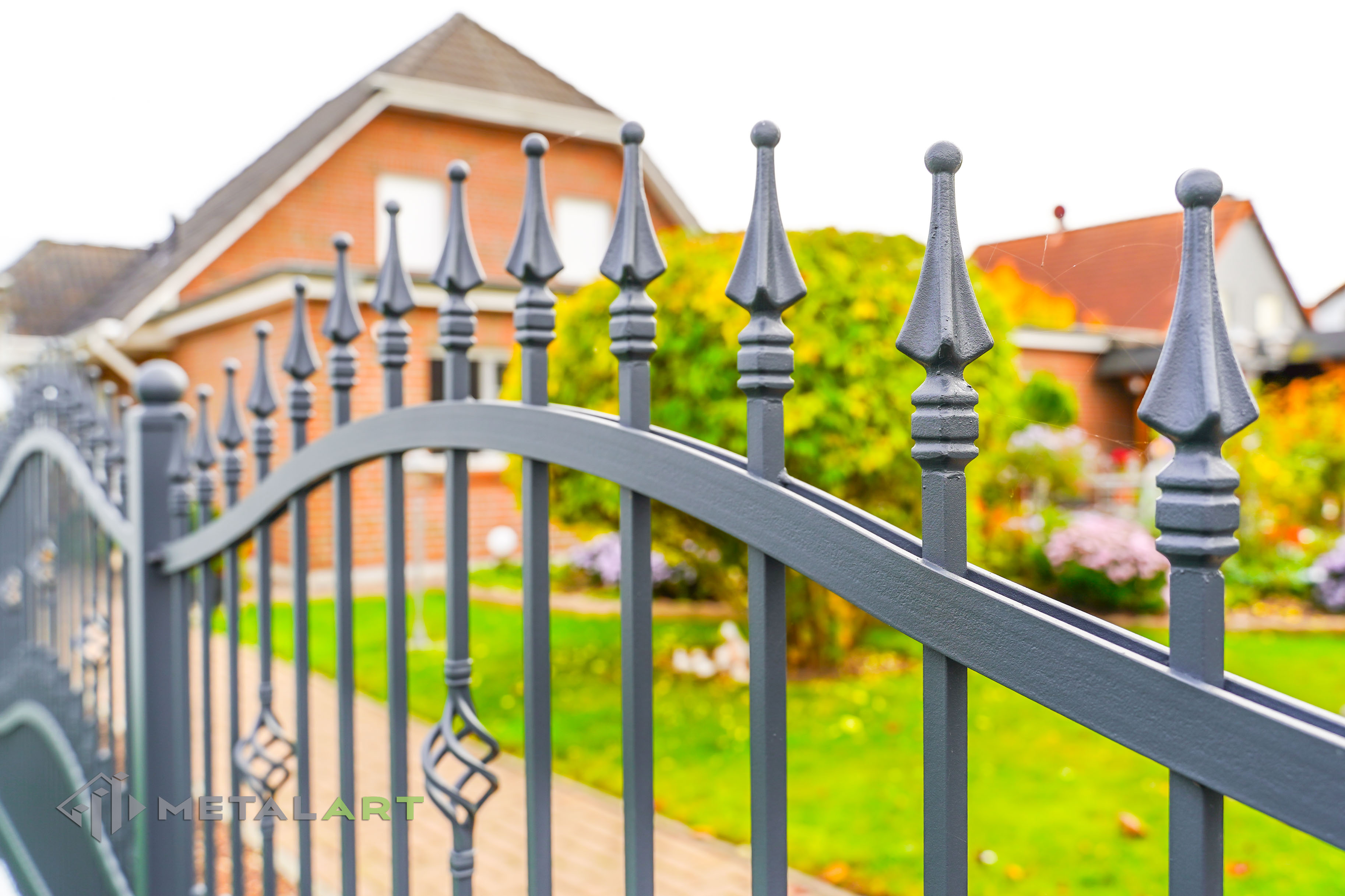 Die Zaunspitzen haben nicht nur eine Schutzfunktion, sondern sind auch eine Möglichkeit, interessante dekorative Lösungen anzuwenden. In diesem Fall wurden geometrische Formen mit kleinen Kugeln in die Zaunspitzen eingesetzt. Diese Kombination bewirkt, dass der obere Teil des Zauns deutlich hervorgehoben wird, aber auch ein Element der Zartheit aufweist.