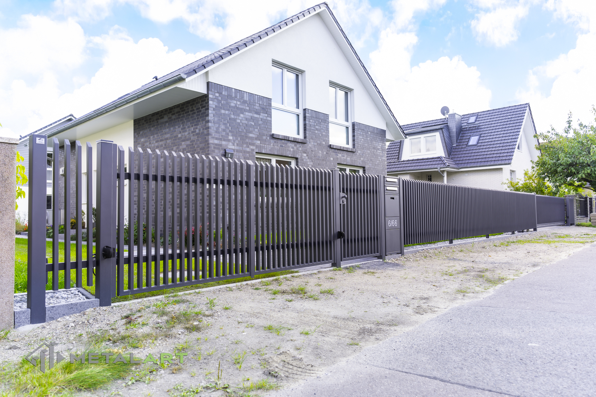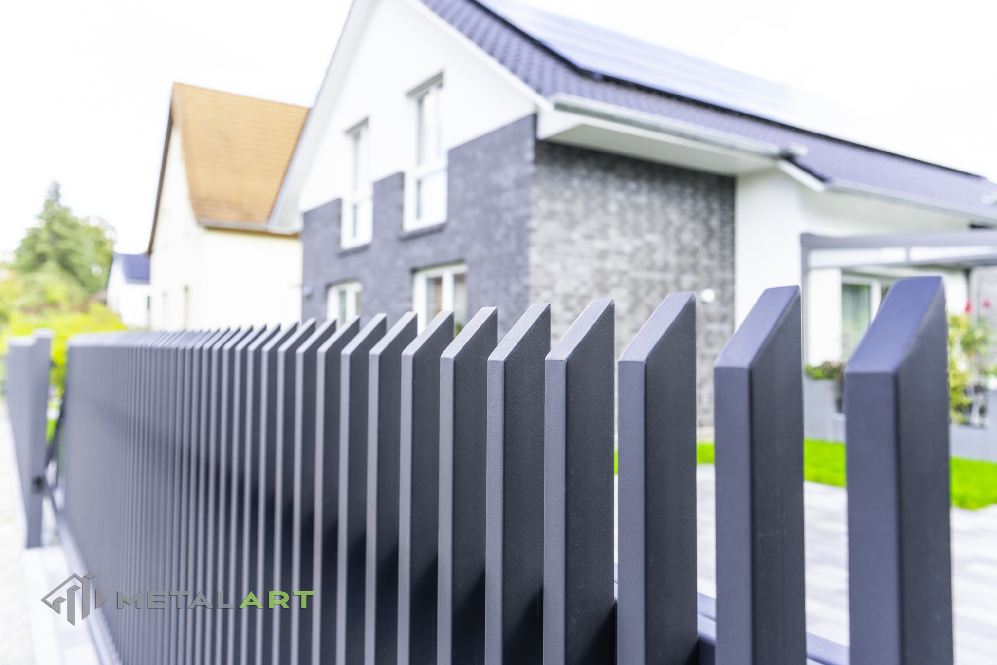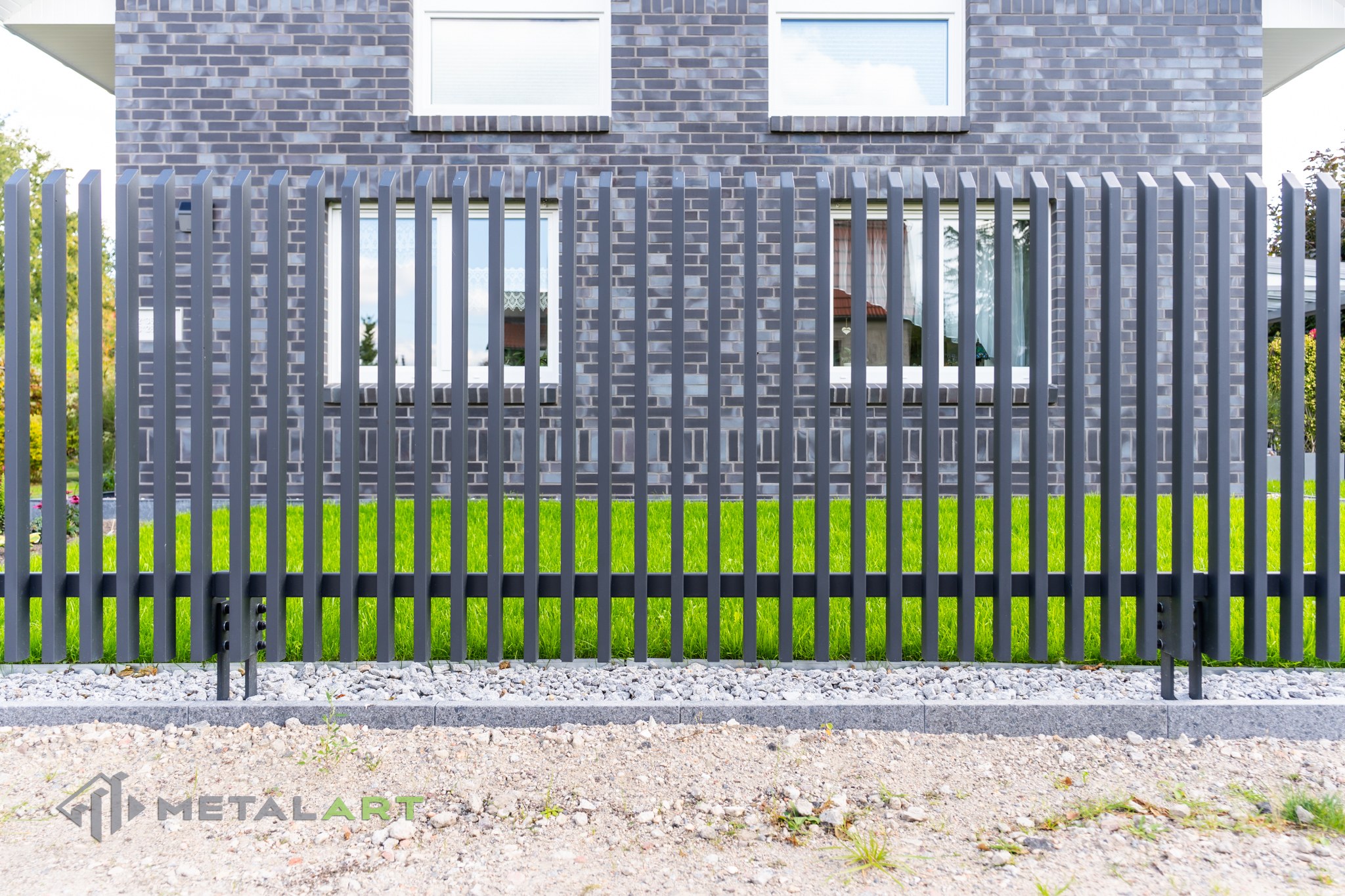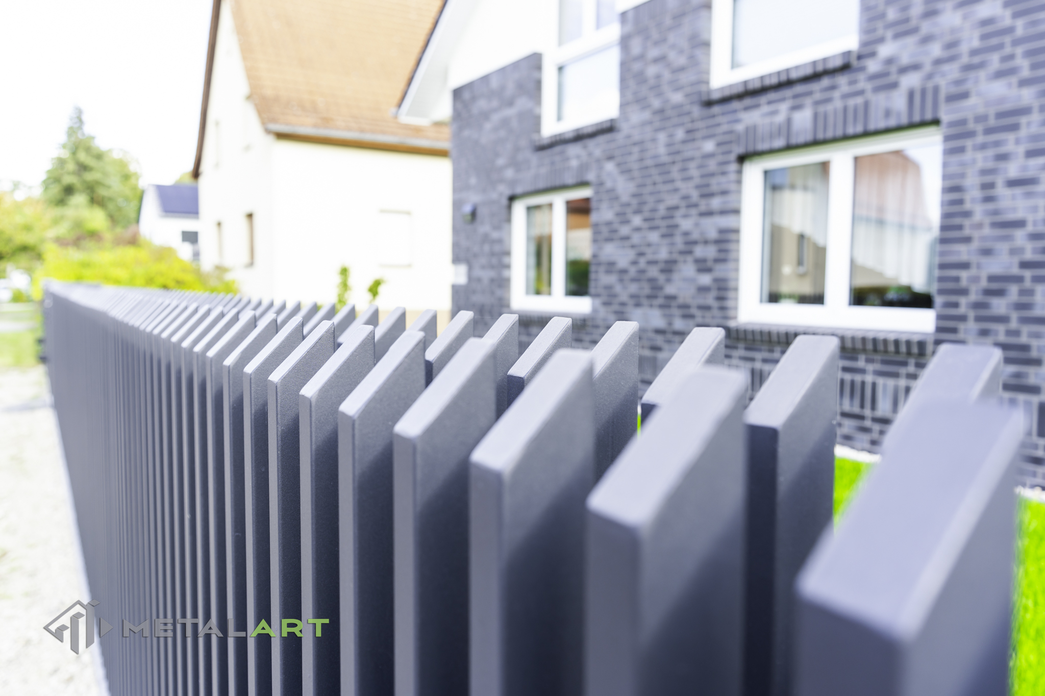 Ein scheinbar gewöhnlicher Zaun, doch dieses Design ist überraschend. Das Material spielt hier eine wichtige Rolle. Der Zaun sieht aus jeder Perspektive anders aus und spielt mit seiner Dreidimensionalität. Der Vorteil dieses Designs ist, dass es neutral bleibt und in viele architektonische Lösungen passt. Die Dicke der Zaunstäben und der Abstand zwischen ihnen, die Höhe und Breite können auf Ihre Bedürfnisse abgestimmt werden. Außerdem können die Zaunstäbe auf unterschiedliche Weise montiert werden.