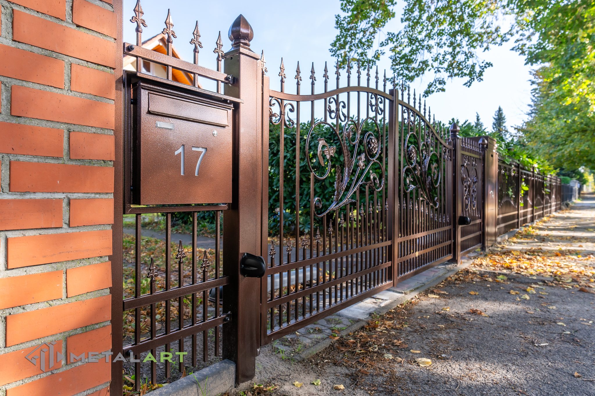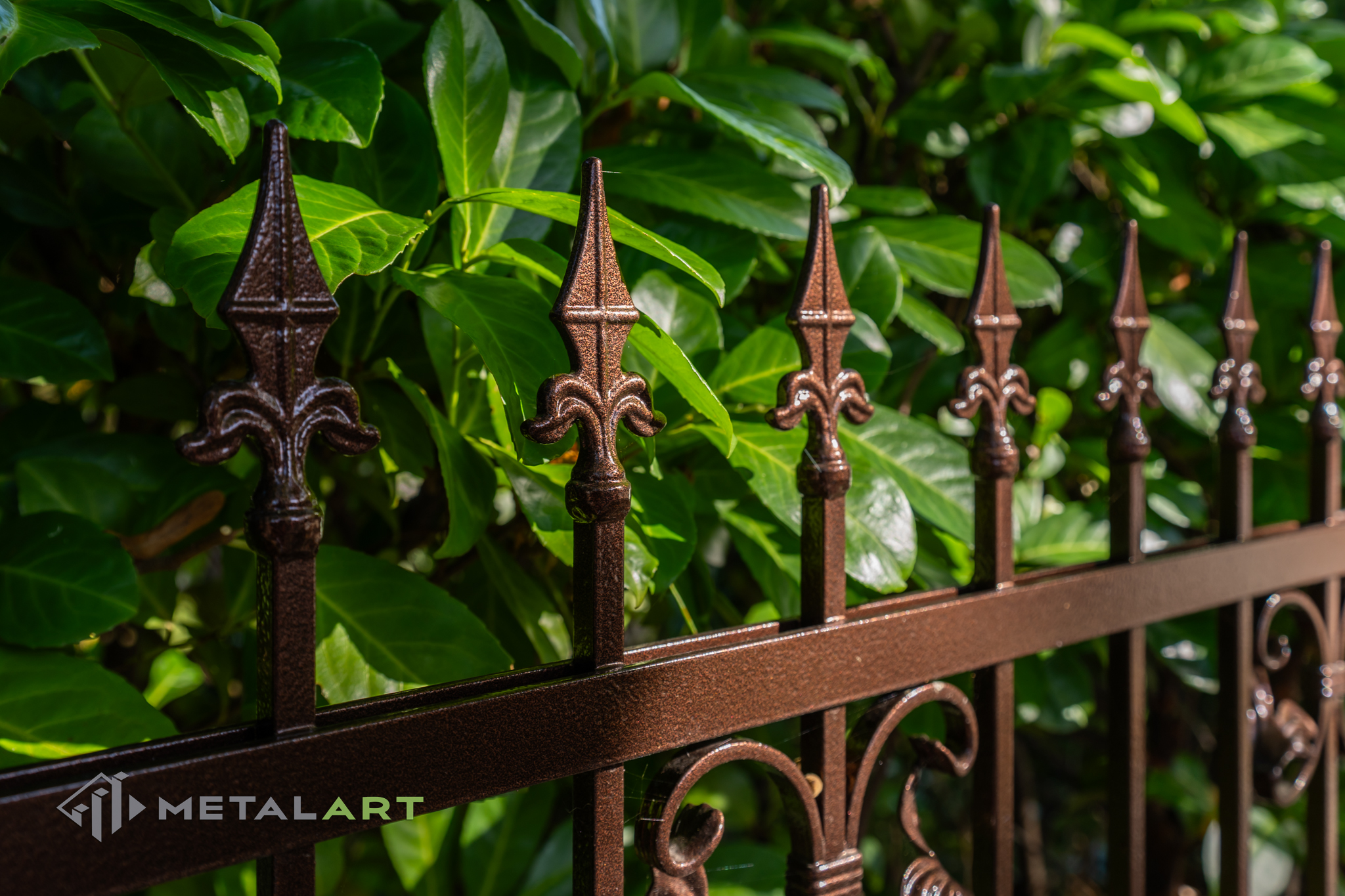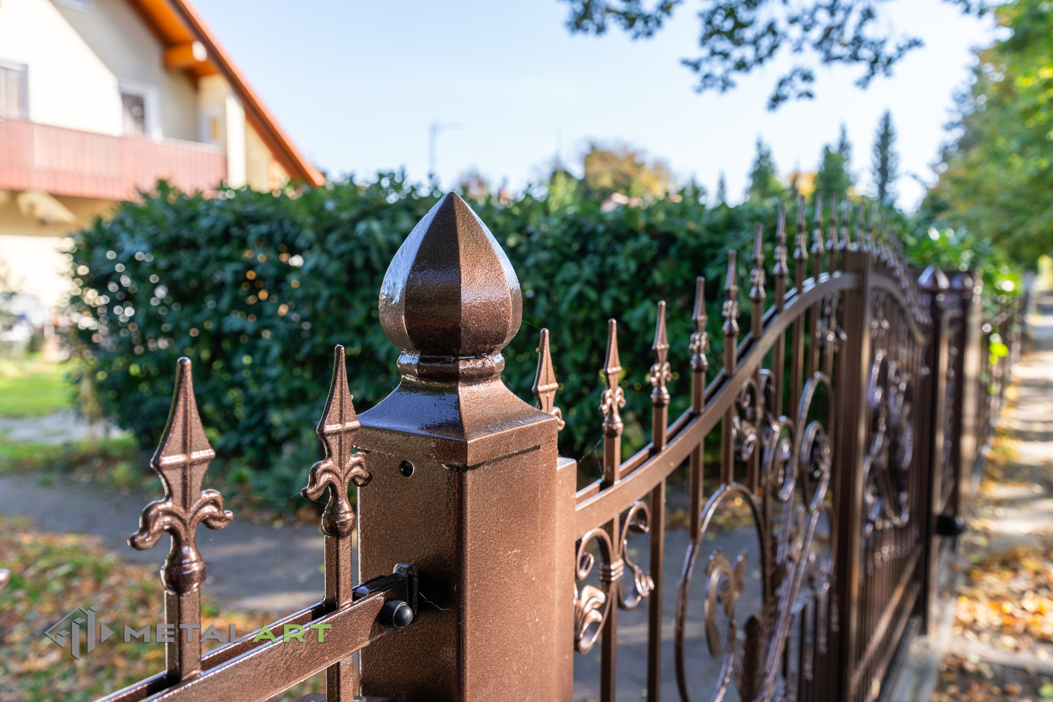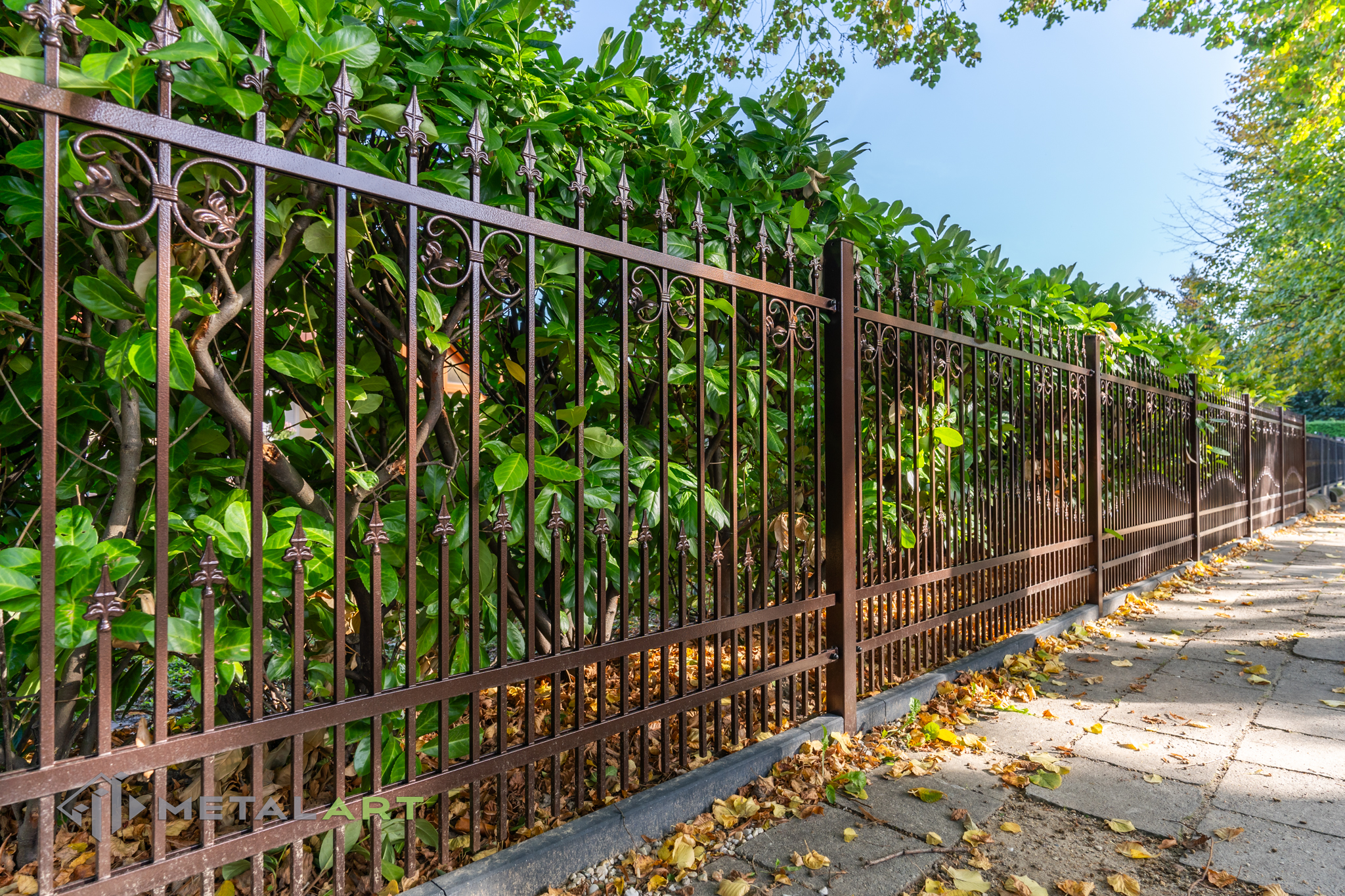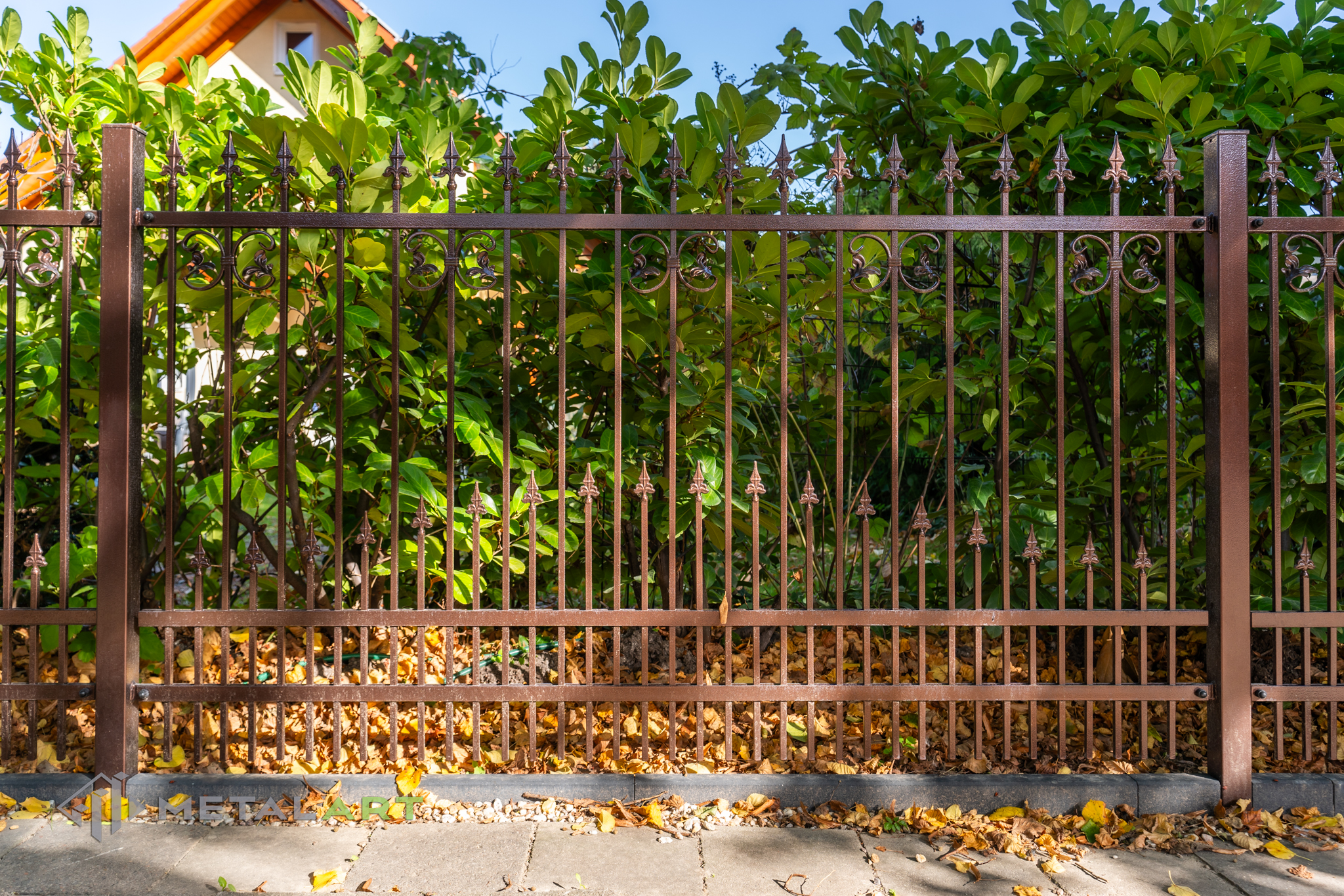Ornamente können in drei Teilen des Zaunfelds platziert werden. Unten, in der Mitte und oben. Hier ist ein tolles Beispiel für die Verwendung von Ornamenten unten und in der Mitte. Das Ganze wird mit dekorativen Zaunspitzen vervollständigt.