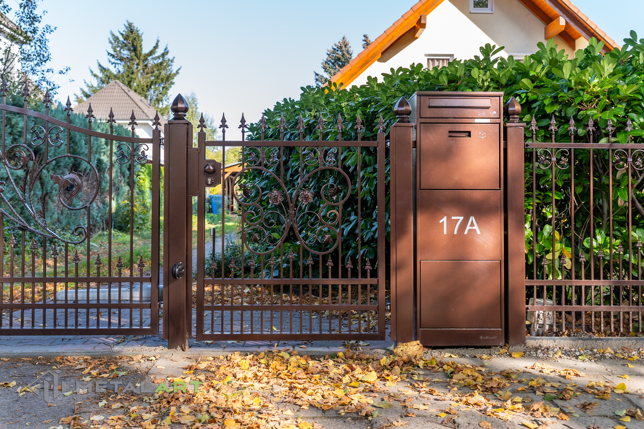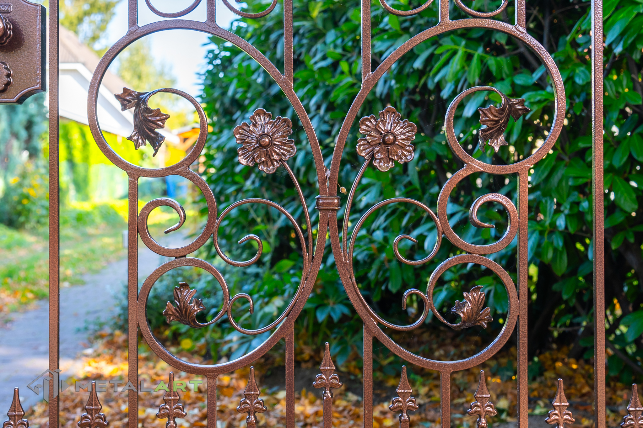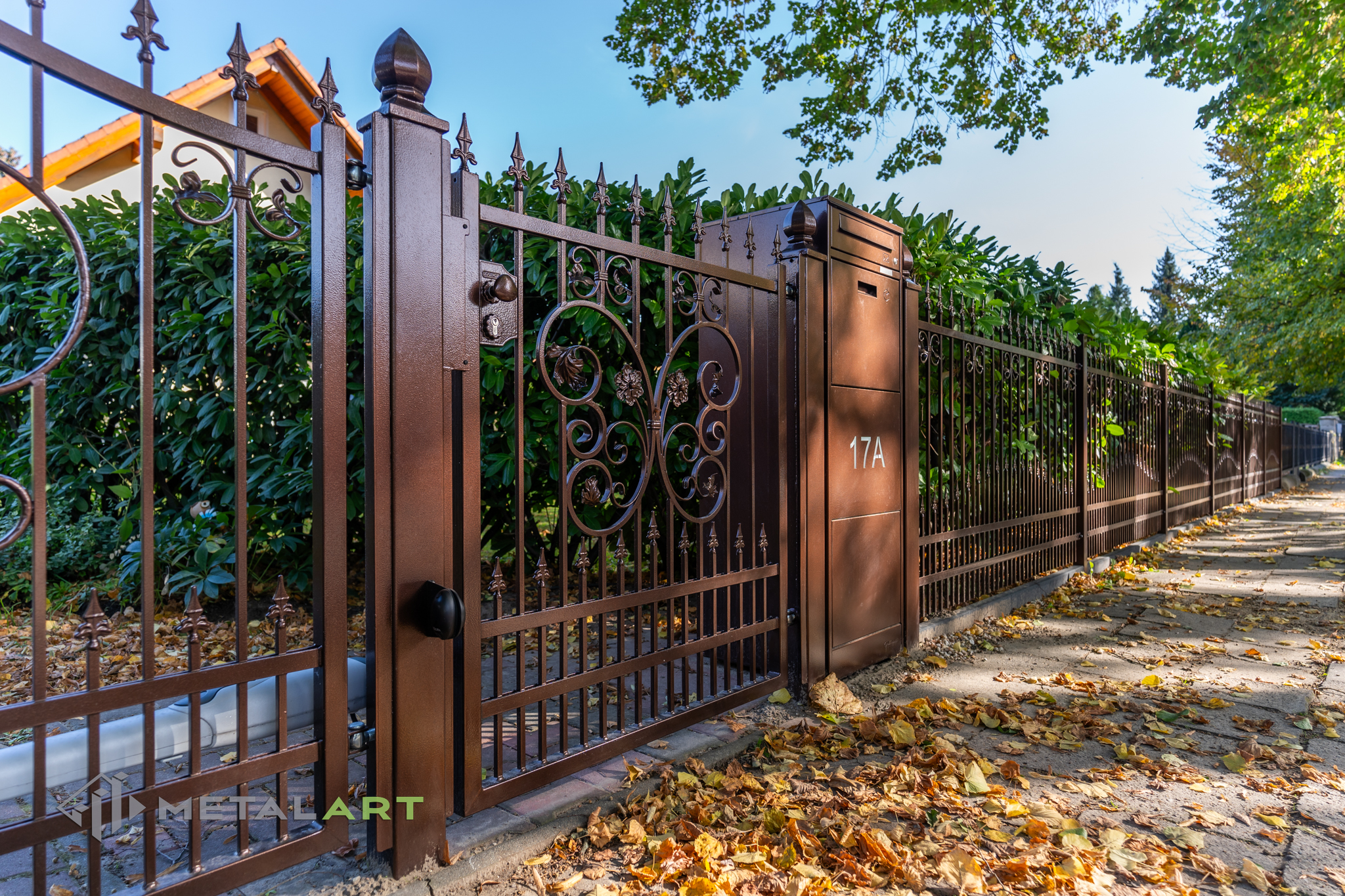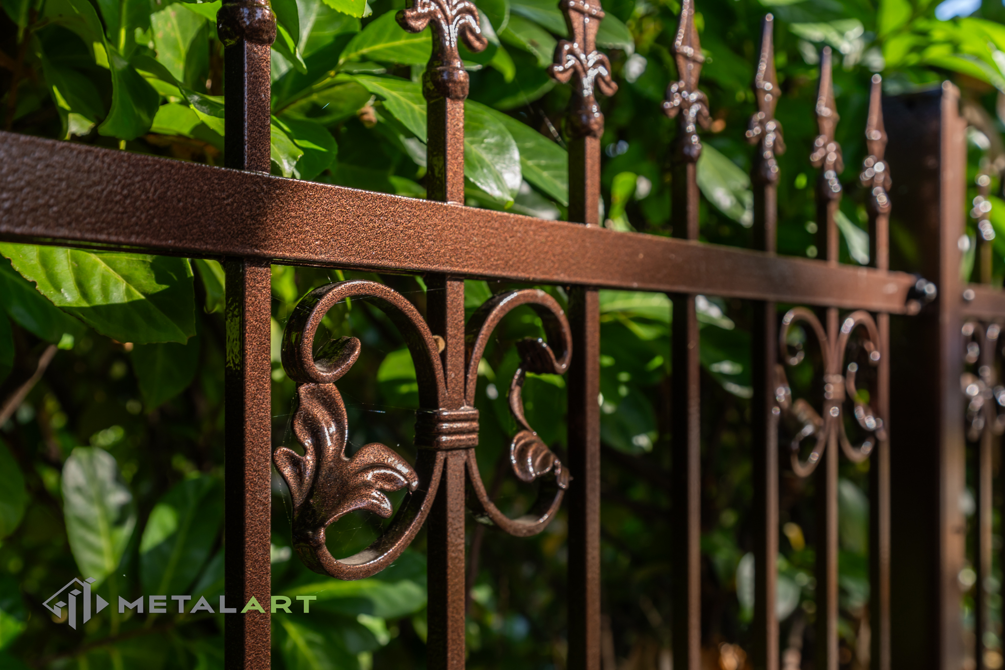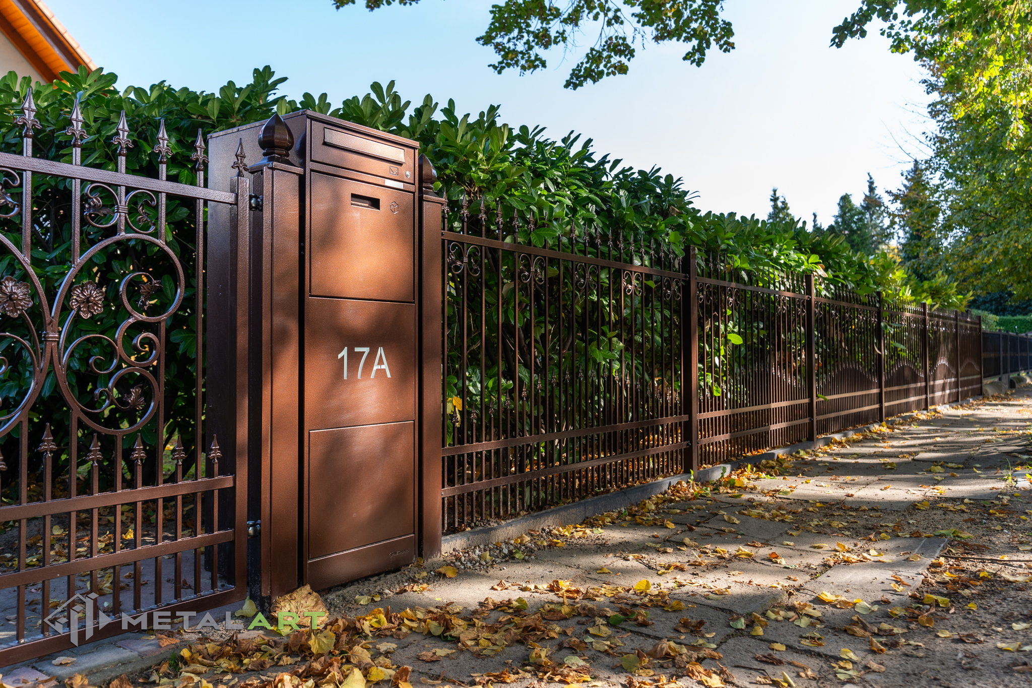 Ornamente können in drei Teilen des Zaunfelds platziert werden. Unten, in der Mitte und oben. Hier ist ein tolles Beispiel für die Verwendung von Ornamenten unten und in der Mitte. Das Ganze wird mit dekorativen Zaunspitzen vervollständigt.
