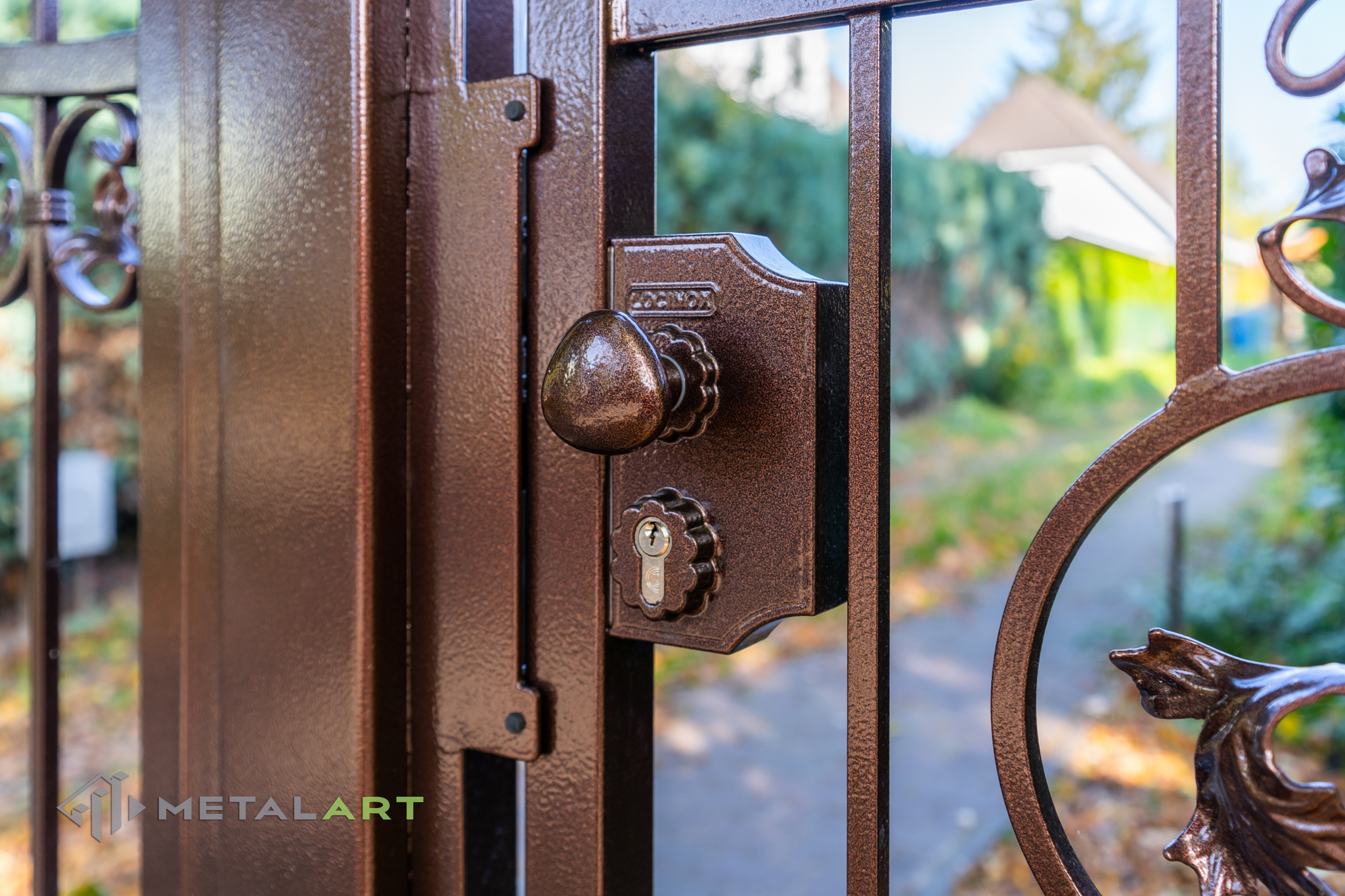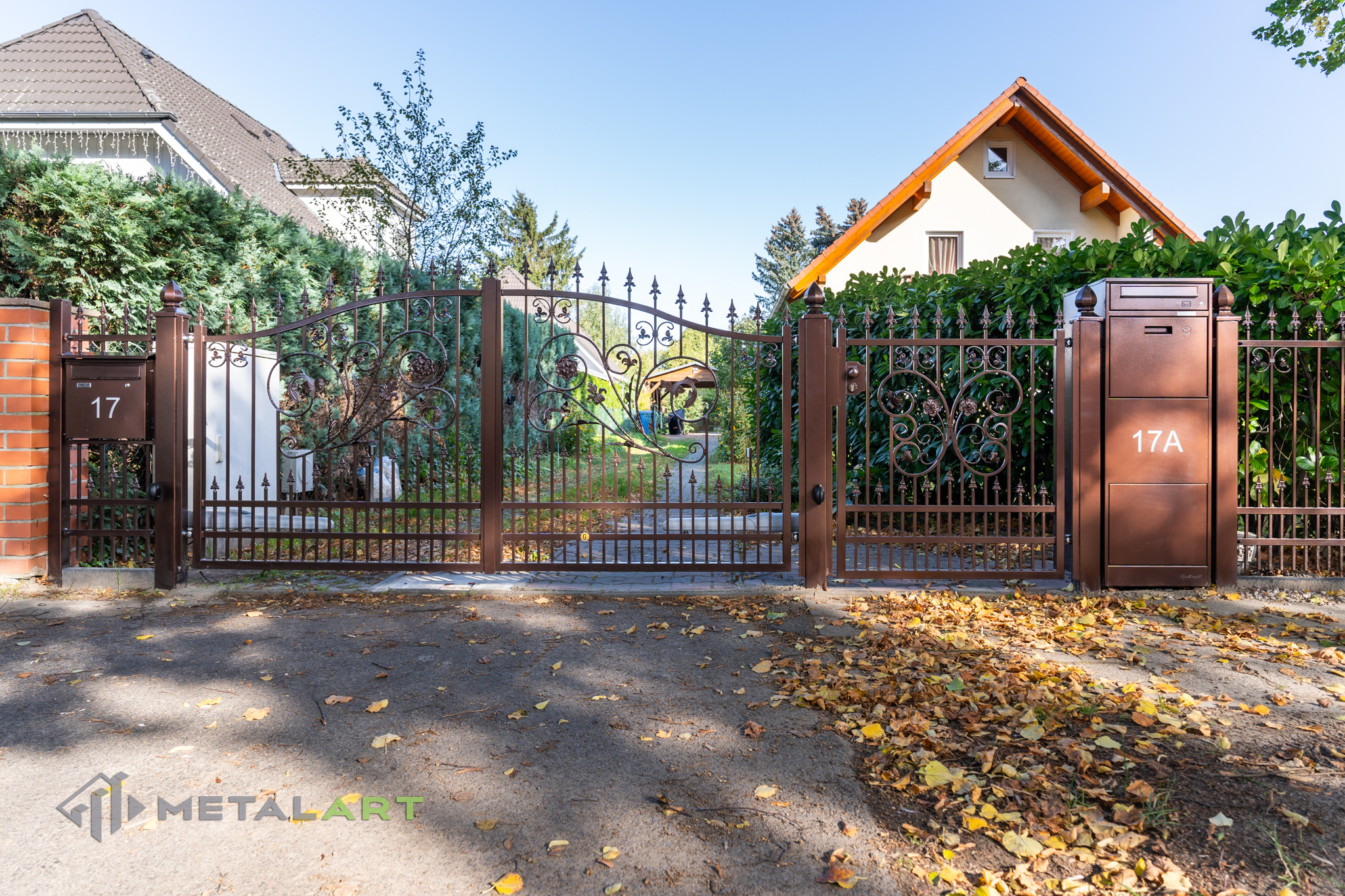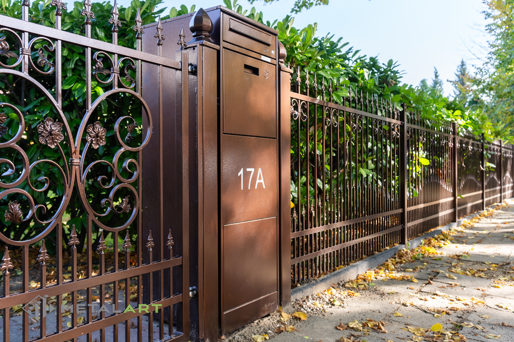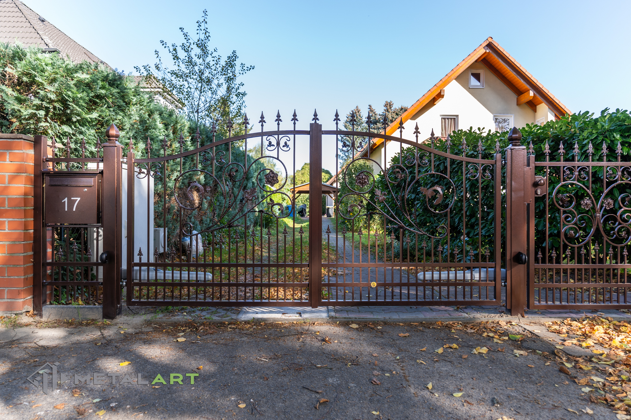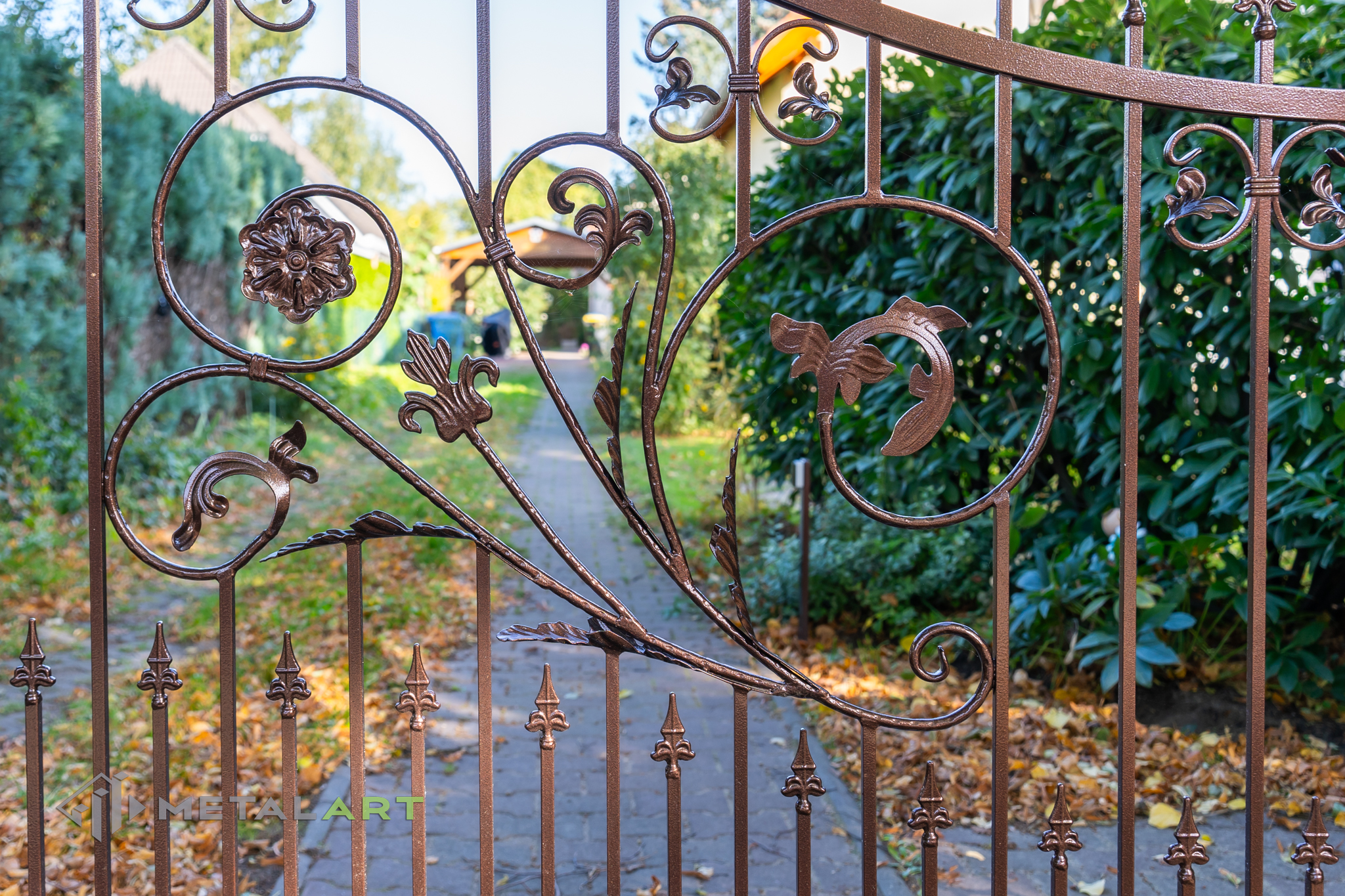 Ornamente können in drei Teilen des Zaunfelds platziert werden. Unten, in der Mitte und oben. Hier ist ein tolles Beispiel für die Verwendung von Ornamenten unten und in der Mitte. Das Ganze wird mit dekorativen Zaunspitzen vervollständigt.