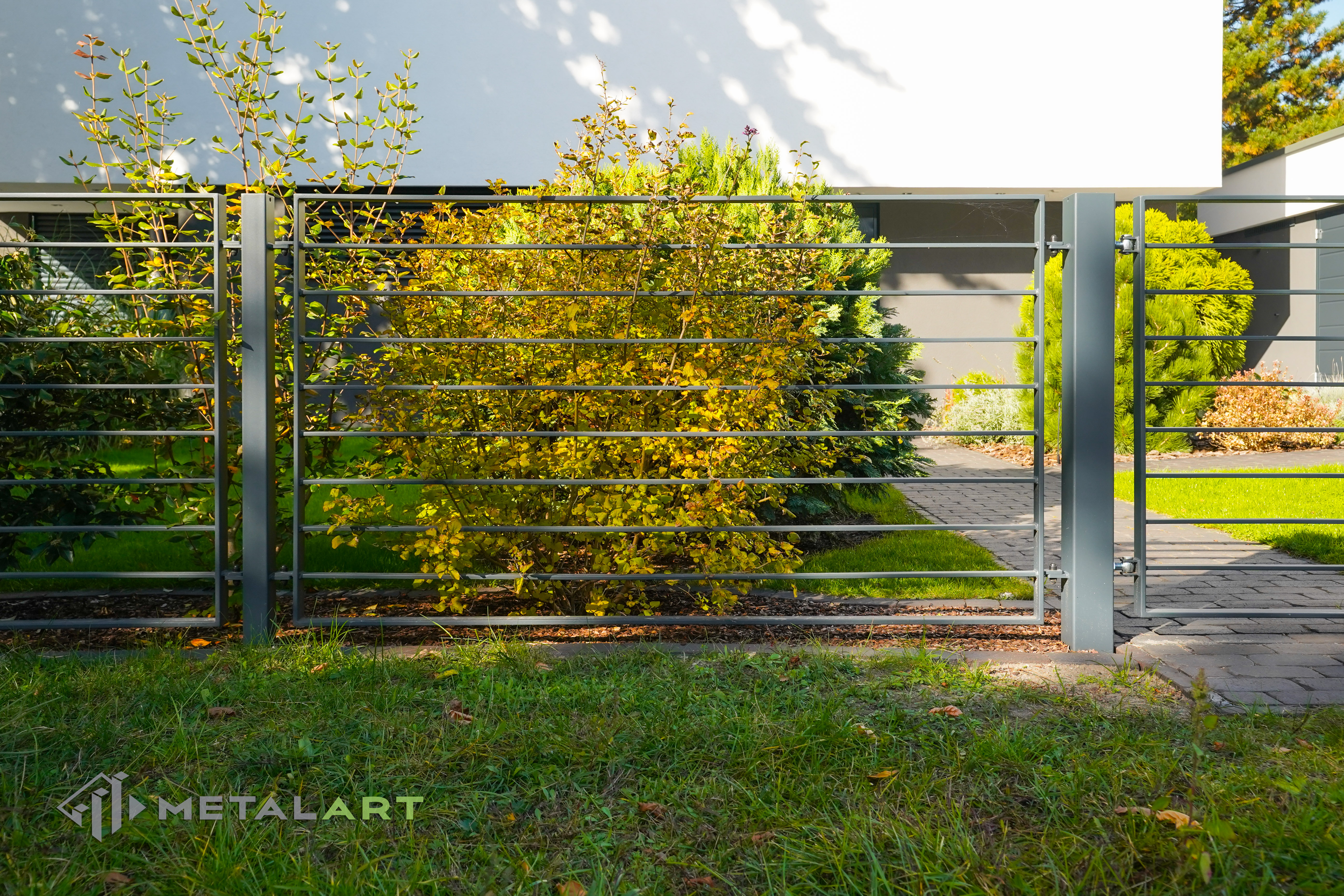 Dieses Zaunmodell harmoniert in seiner Grundform gut mit moderner Architektur. Es wird von Kunden gewählt, die Wert auf Einfachheit legen und den Raum deutlich hervorheben wollen. Die Größe, der Abstand und das Muster der Zaunfelder können frei bestimmt werden. Auch Farben, matt oder glänzend sind auf Anfrage erhältlich.