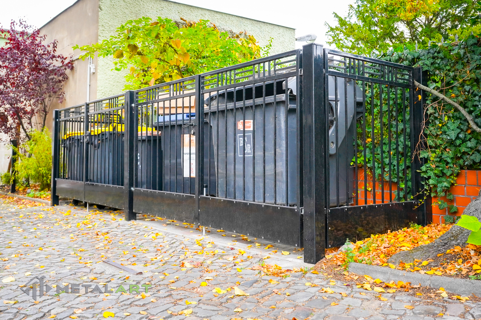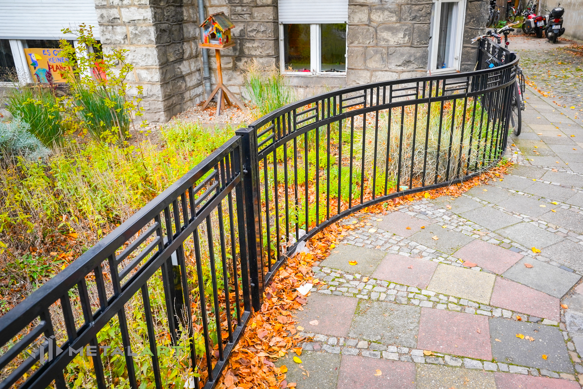 Dieses Modell ist eine sehr elegante Lösung. Er passt dank seiner Geometrie perfekt in die moderne Architektur. Die Farbe und die Textur tragen nur zum Charme bei. Geometrisches Ornament, das an der Oberseite des Zauns angebracht ist, grenzt zusammen mit einer zusätzlichen Querstrebe den Raum klar und dekorativ ab. Alles leicht und schön grafisch. Perfekt!