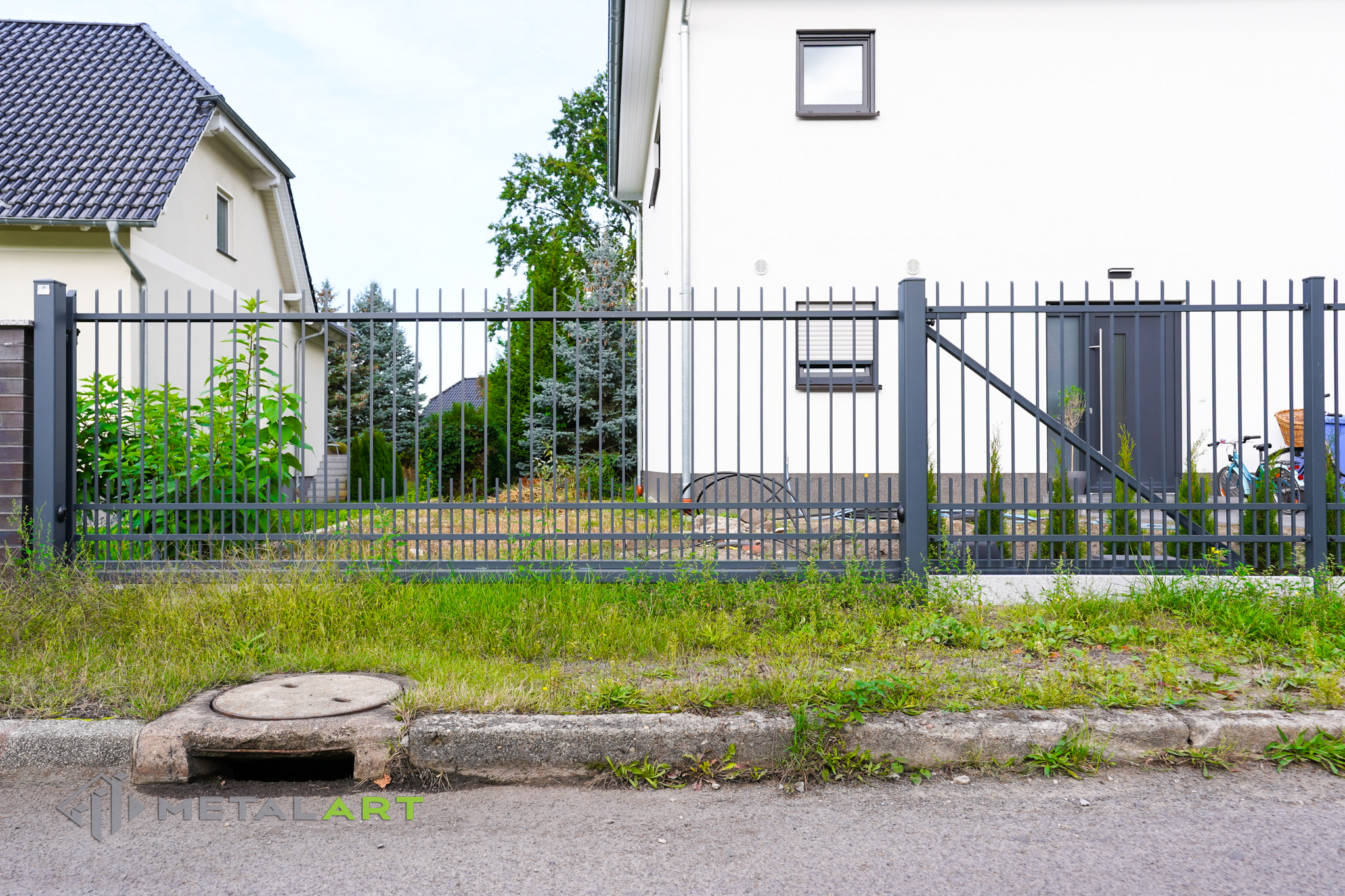 Der klassische Zaun mit dem Doppelflügeltor und Schiebetor