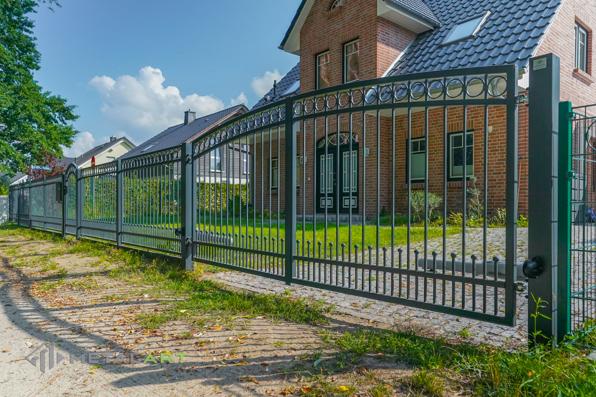 In diesem Projekt wurde der obere und untere Teil des Zauns dekoriert. Gerade Linien sind das dominierende Element, das das Zaunfeld verdickt, und das Ganze wird mit einem anmutigen Ornament auf der Oberseite abgeschlossen. Die Zaunkappen verleihen dem Zaun Erhabenheit und ordnen gleichzeitig die Vielzahl der hier verwendeten Ornamente. Ein wirklich schöner Zaun!