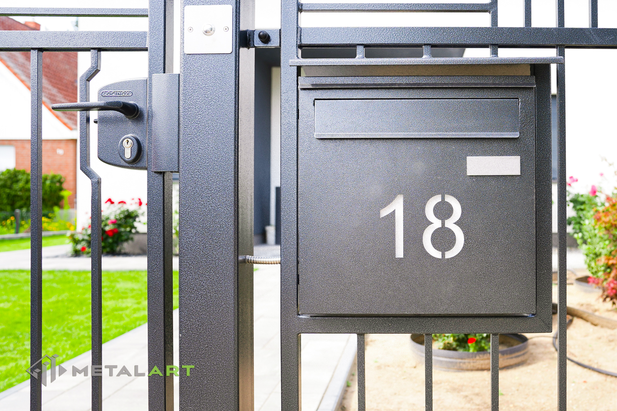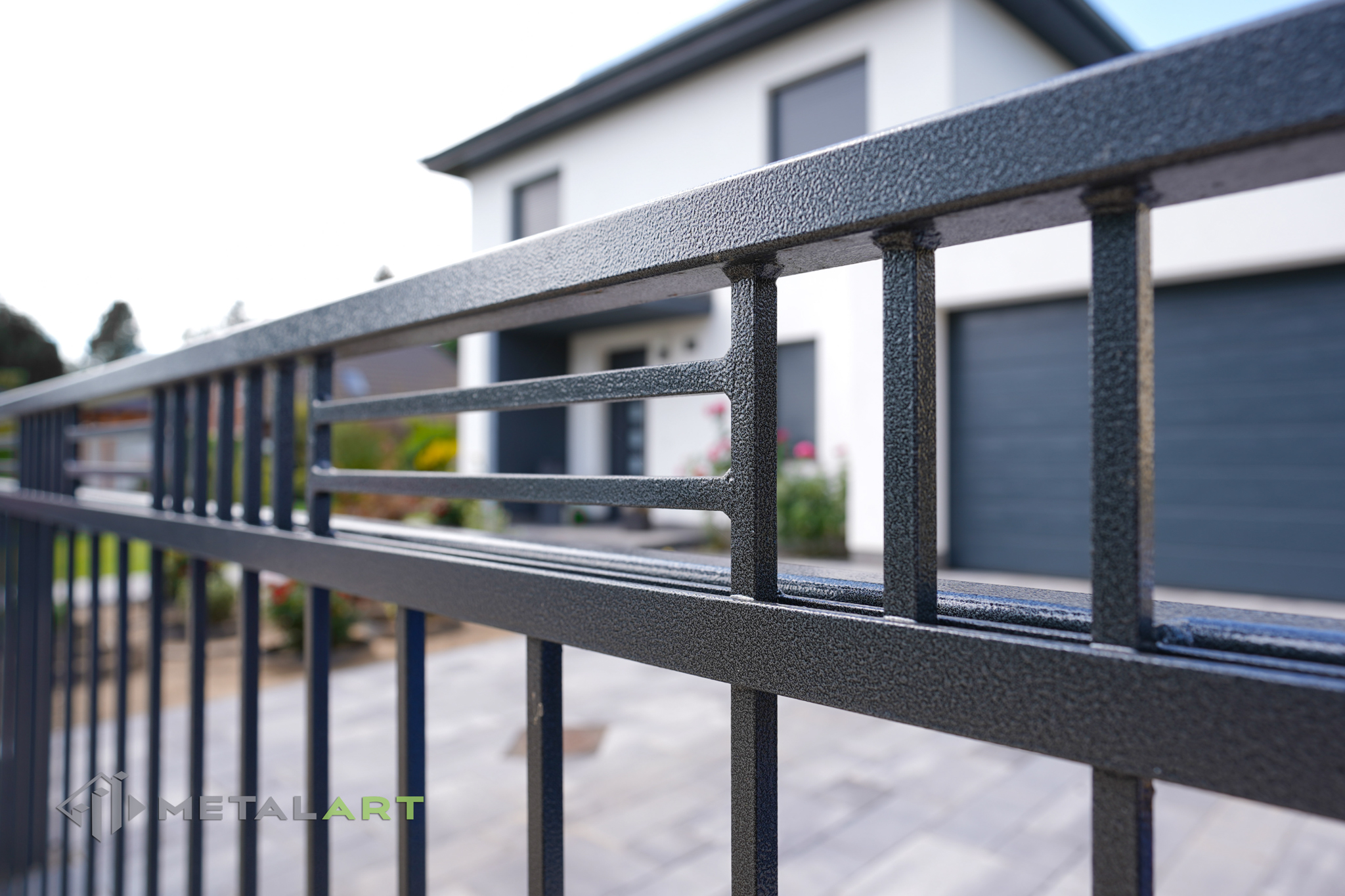 Dieses Modell ist eine sehr elegante Lösung. Er passt dank seiner Geometrie perfekt in die moderne Architektur. Die Farbe und die Textur tragen nur zum Charme bei. Geometrisches Ornament, das an der Oberseite des Zauns angebracht ist, grenzt zusammen mit einer zusätzlichen Querstrebe den Raum klar und dekorativ ab. Alles leicht und schön grafisch. Perfekt!